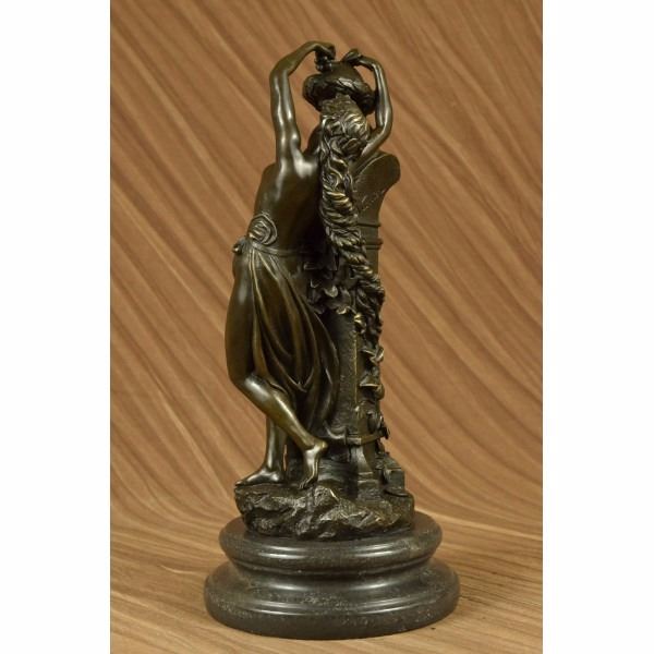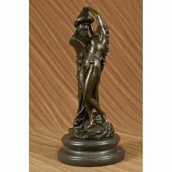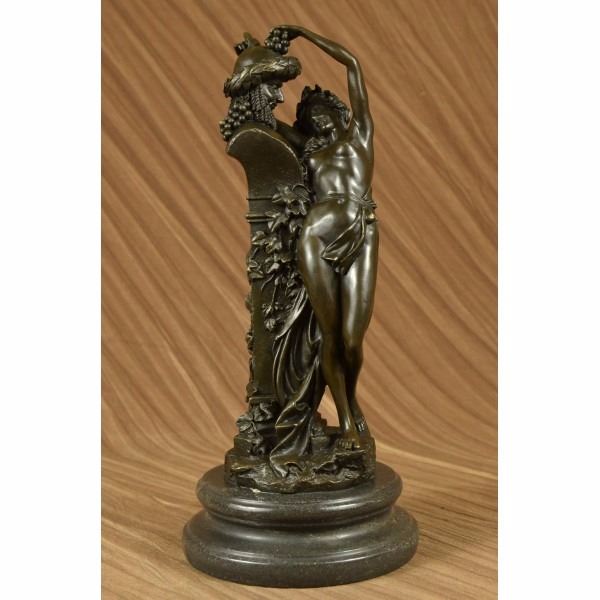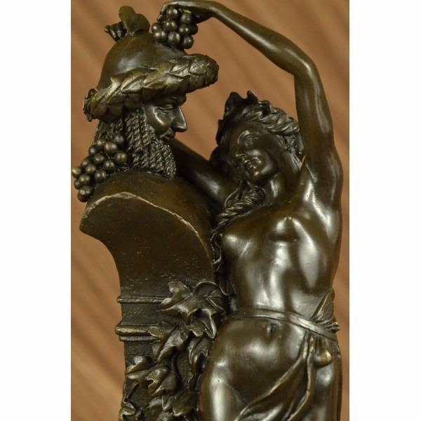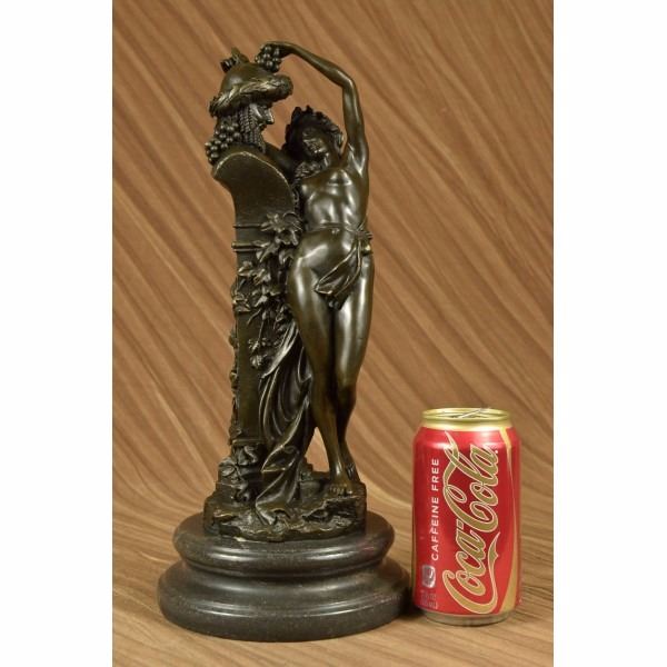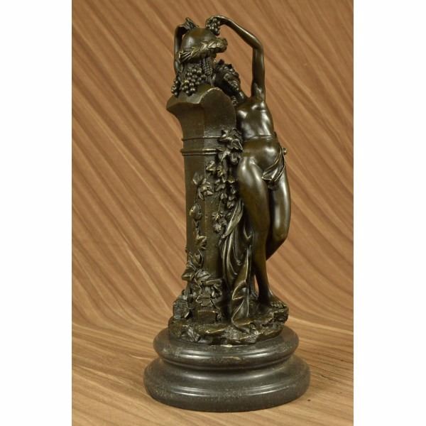She tries her hardest to control herself against the temptation but caves in. She throws herself on to the sculpture and clutches on no resistance. She is in pure frustration as all she tries to do is become one with the satyr sculpture. Although he is a statue he still smiles and smirks making the nymph more frustrated then she already is. This sculpture is call Frustration, the satyr continuously tempts her and there is nothing she can do but be a fool for him. She wears nothing but a long flowing robe that caresses the front of her body and falls down and wraps around the sculpture. Beautiful ivy crawls up the sides of the pedestal on which the satyrs head sits on. In the satyrs hair you can see two horns and bushels of grapes. At the bottom of the sculpture you will find the word Frustration in the base. This sculpture was cast using the Lost Wax Method and has a gorgeous two tone brown patina. This sculpture is 100% handmade and is 100% bronze, it is mounted on a marble base and is signed. Condition: This sculpture is in a perfect condition. Bronze Dimensions with Marble Base:Height 14" x Width 6" Marble Dimensions: Diameter 6" Height without base: 12" Weight : 13 LBS Inventory : 27E7537472