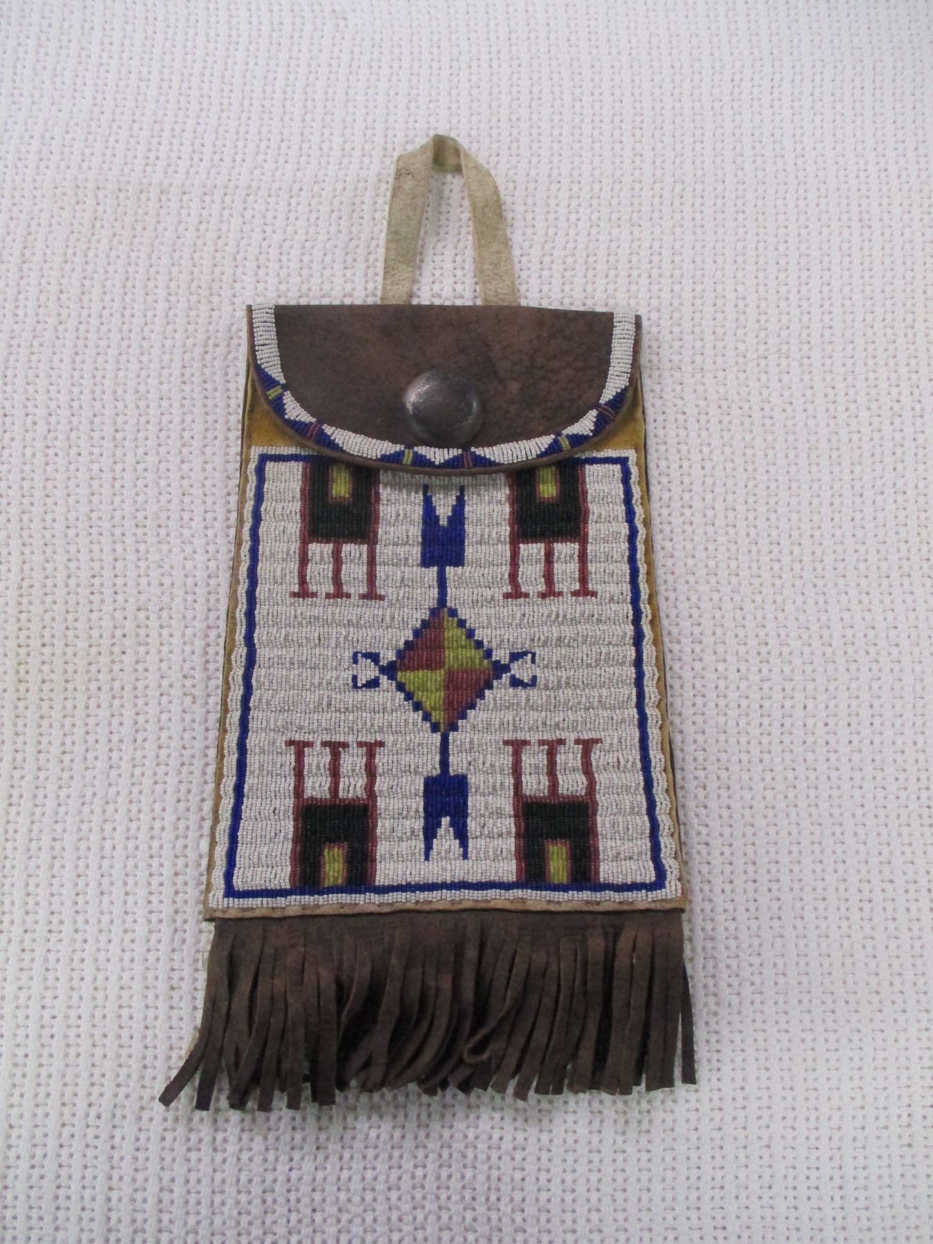 Large fully beaded dispatch bag. Made with heavy leather and beaded on brain tanned buckskin.