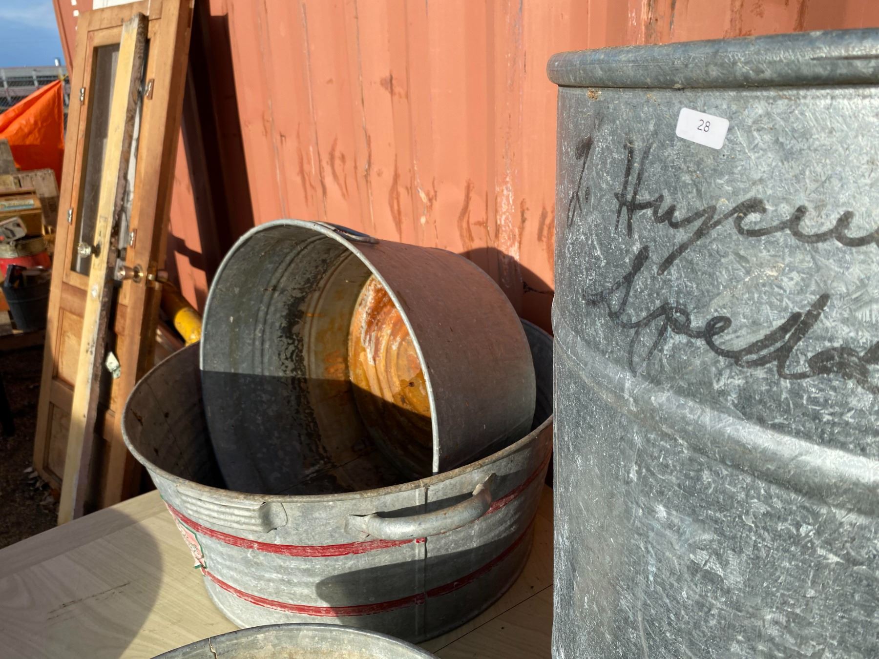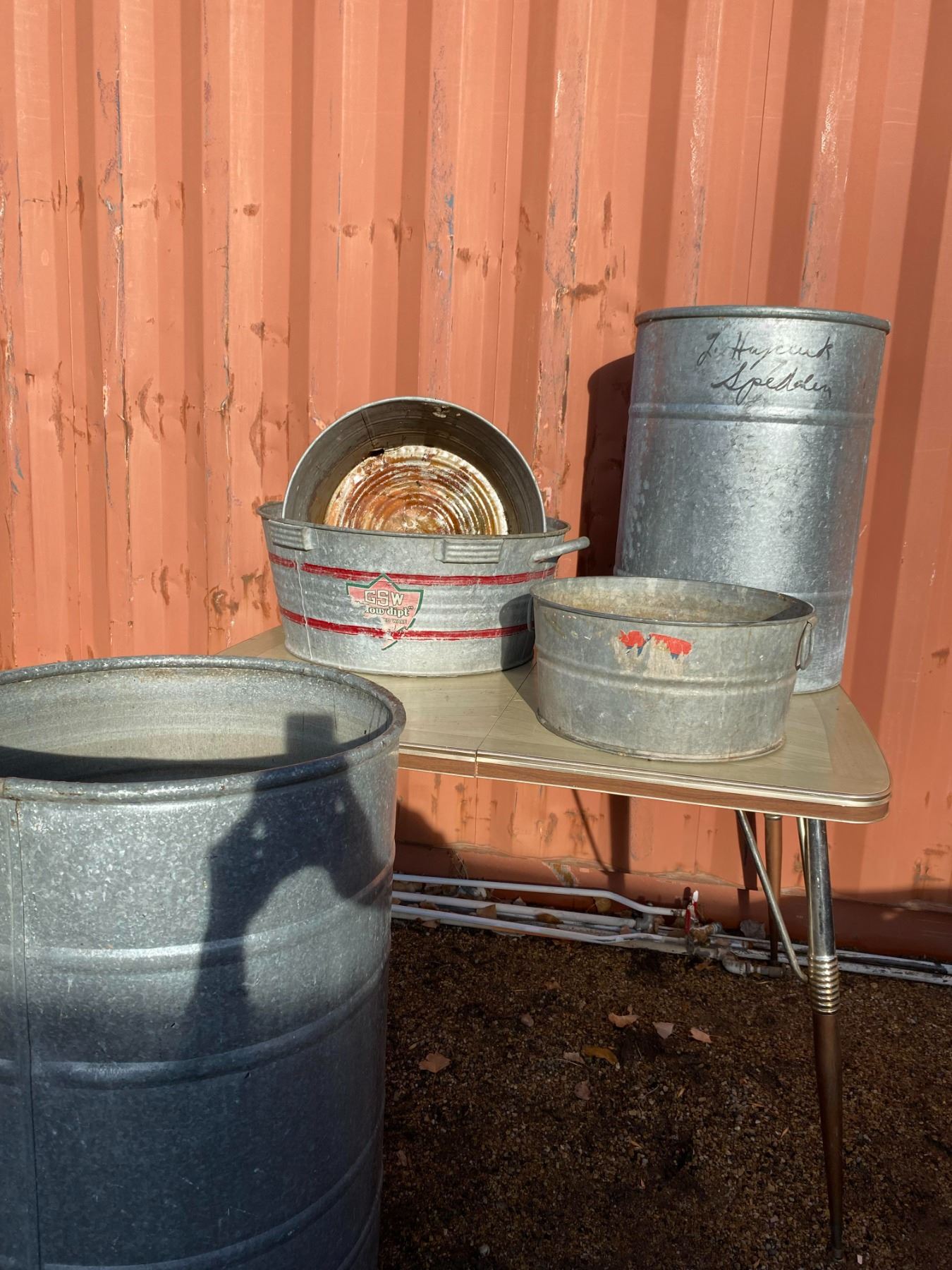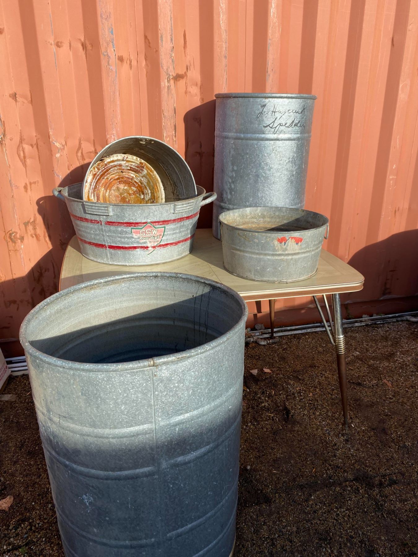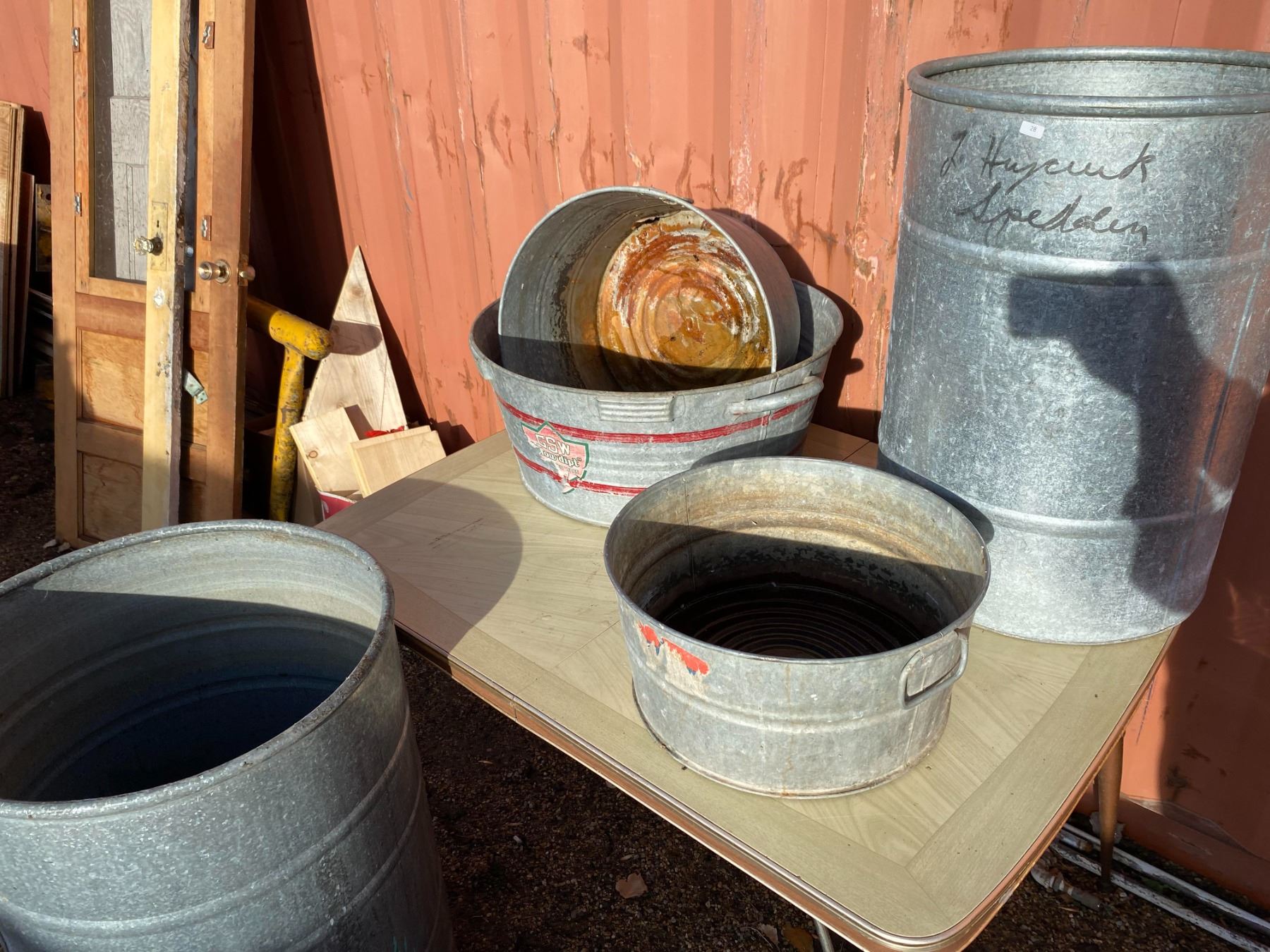 A collection of large galvanized wash tubs, utility bins, and basins offering classic farmhouse and industrial charm. These vintage metal pieces are great for decor, gardening, or prop use, each showing surface rust and age wear consistent with use.