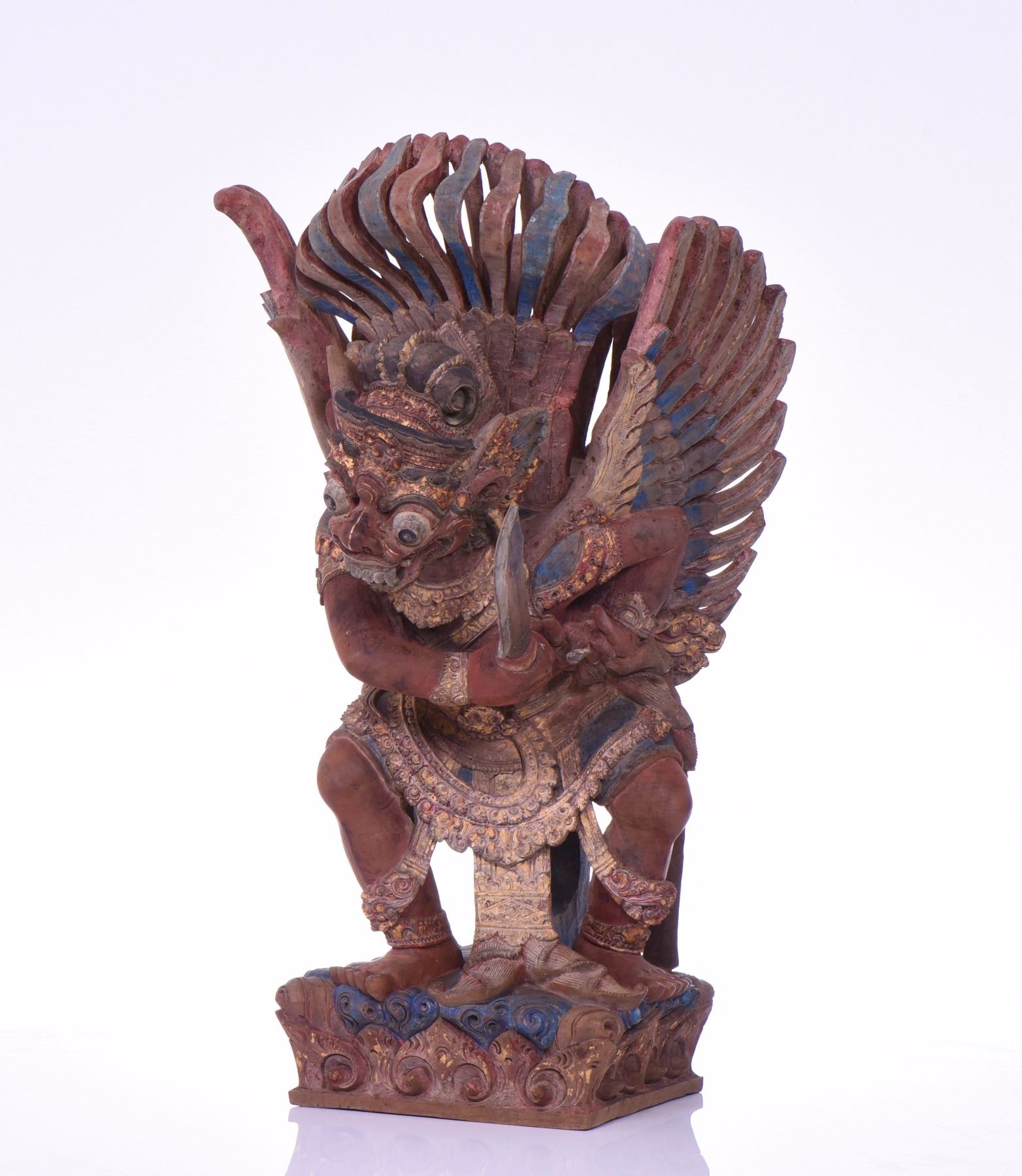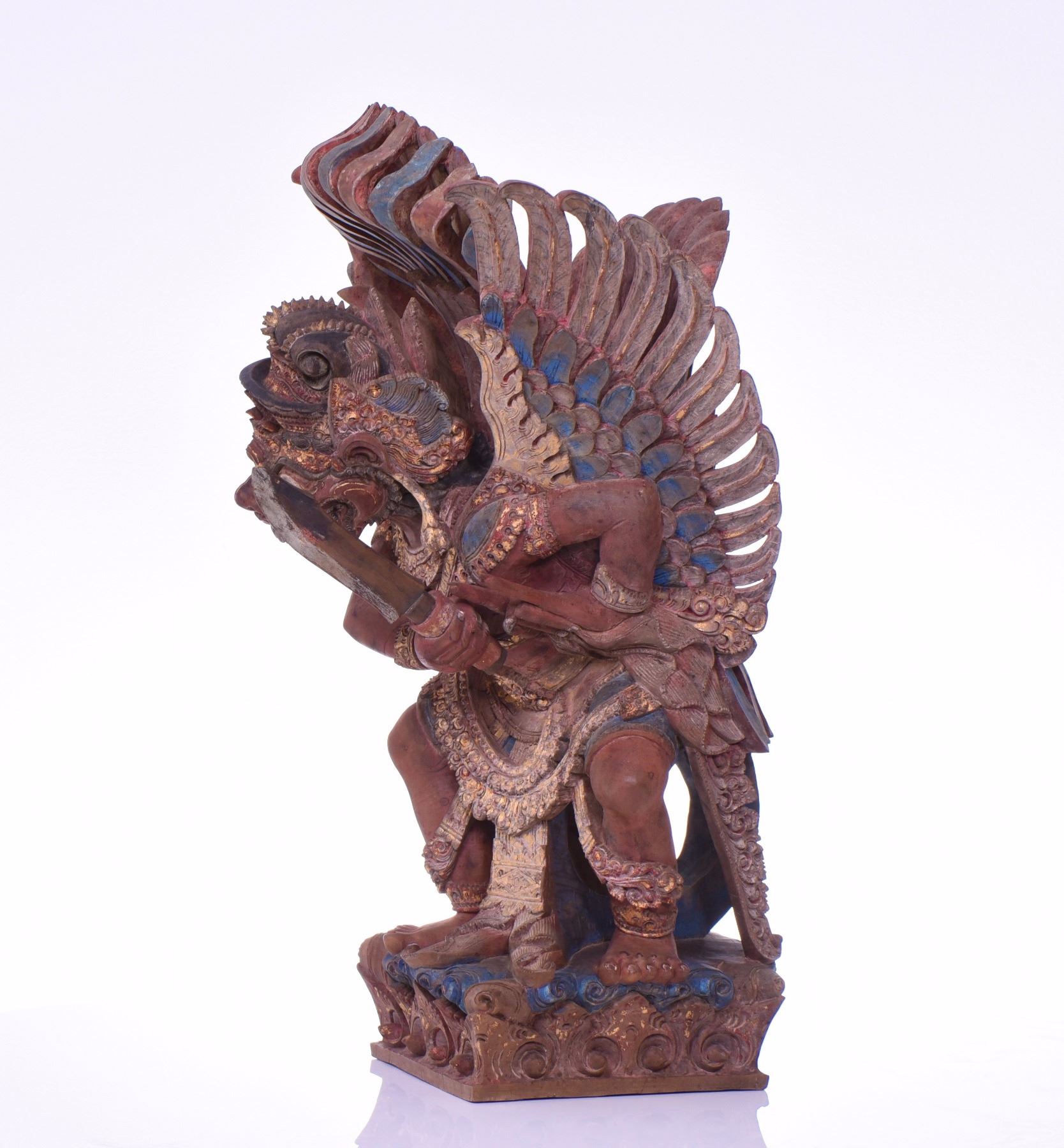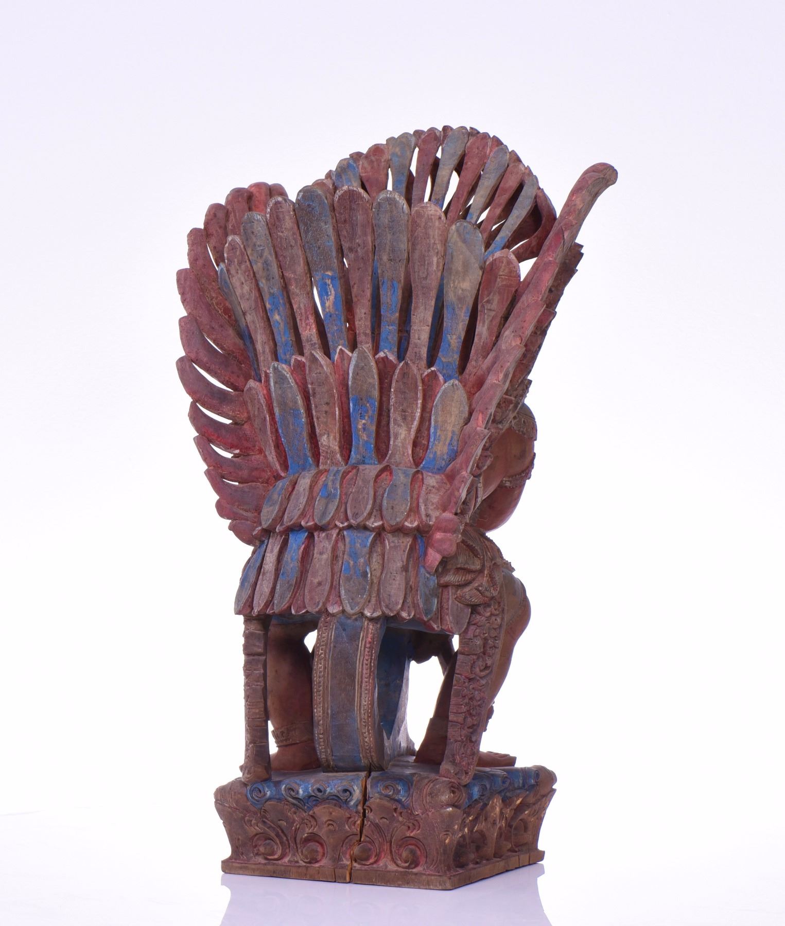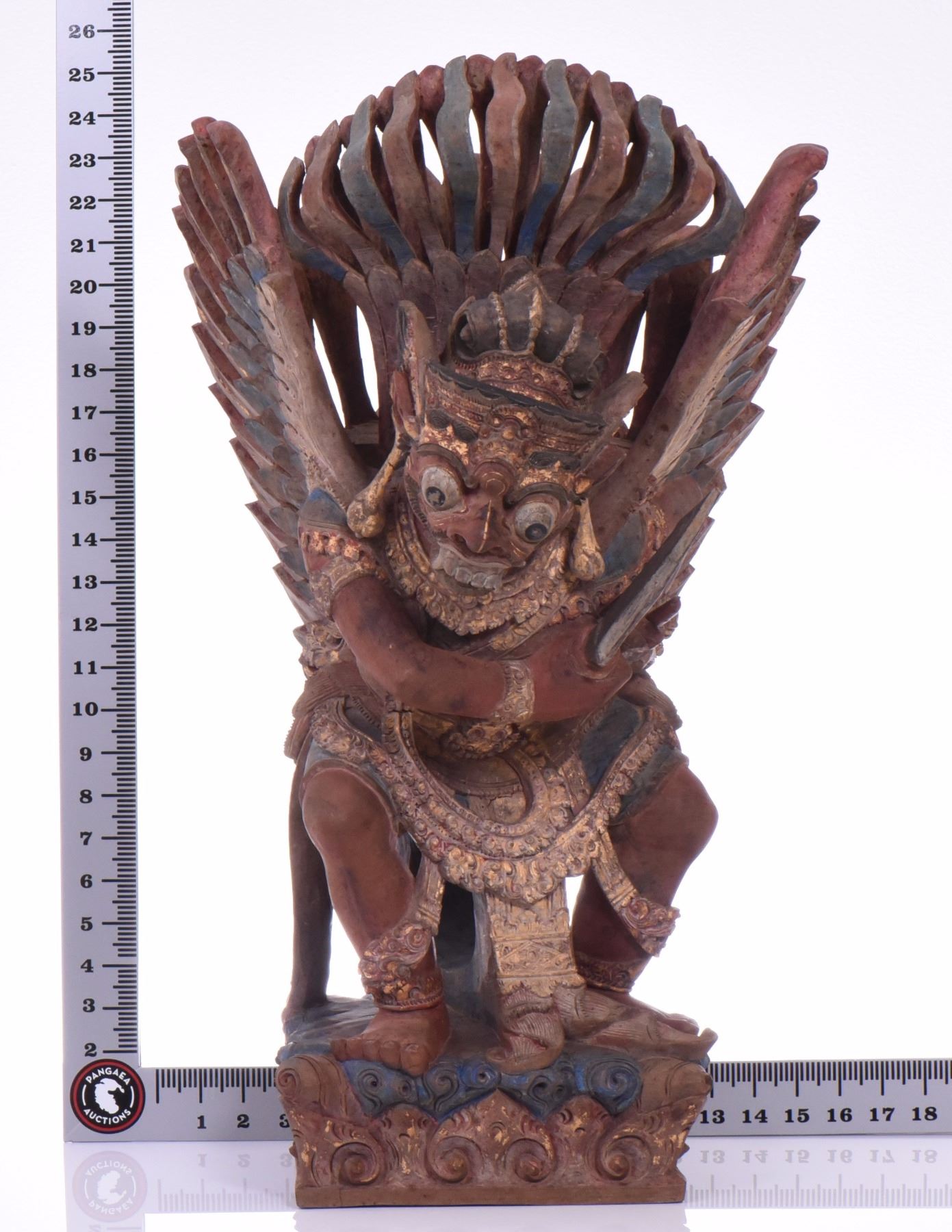Indonesian Polychrome Hand Carved Wood Hindu Deity Of A Young Vishnu. Estimated more than 100 yrs. old. Indonesian art consists of various artistic expressions and artworks of the archipelagic nation of Indonesia. It includes both age old art forms and recently developed contemporary art. Indonesian arts have experienced foreign exposures and influences most notably from India, Arabia, China and Europe. The nation consists of 13,466 islands where 922 are permanently inhabited by over 300 ethnic groups speaking more than 700 living languages. Wood and stone sculpting tribal art has flourished within the culture of Nias, Batak, Asmat, Dayak and Toraja. Between 8th to 15th century, Javanese civilization has developed a refined stone sculpting art and architecture which was influenced by Hindu-Buddhist Dharmic civilization. The art of wood carving is quite well-developed in Indonesia and certain areas are well known for its refined wood carving culture in Jepara and Bali. Balinese painting tradition are notable for its highly vigorous yet refined intricate art which resembles baroque folk art with tropical themes. Modern Indonesian paintings were pioneered by Raden Saleh, an 19th century an Arab-Javanese painter renowned for his romantic-naturalistic work during Dutch East Indies period in Indonesia. Prominent Indonesian painters in 20th century includes Basuki Abdullah, Lee Man Fong, Ida Bagus Made, Dullah and Affandi. (Wikipedia) Size: See Ruler Photo. (Photos Represent The Lot Condition, Pangaea Auctions)