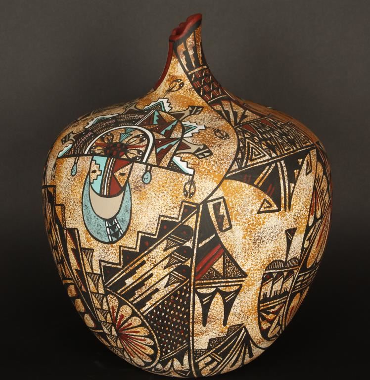 S. Sarrao signed on base. Beautiful hand painted geometric Kokopelli and frog design. Retail $1000 purchased in New Mexico art gallery. Measures 16"x12"