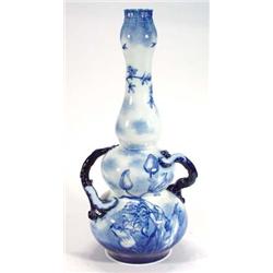 Large George Jones flow blue and white twin handled 'Tulip' design double gourd vase with slender…