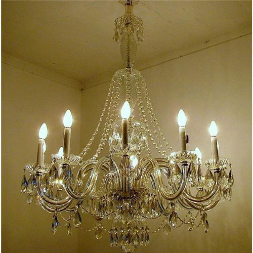 Classic Georgian Full Lead Crystal 12 lights chandelier, measuring 49 inches H and 38 inches wide , Czech full lead crystal , fantastic crystal quality, transparency and purity, it creates lot of light splatters and rainbows with the Photo Flash, is not easy to picture, for this reason you will see a reddish picture made without Flash. Restored and rewired, this item still uses the E14 sockets , allowing use of 60W bulbs, and we will send you 20 adequate 110V bulbs , and indications to buy them online in the U.S. Shipping within U.S. is $240, including wooden crates and insurance. This item is sent disassembled as any crystal chandelier.