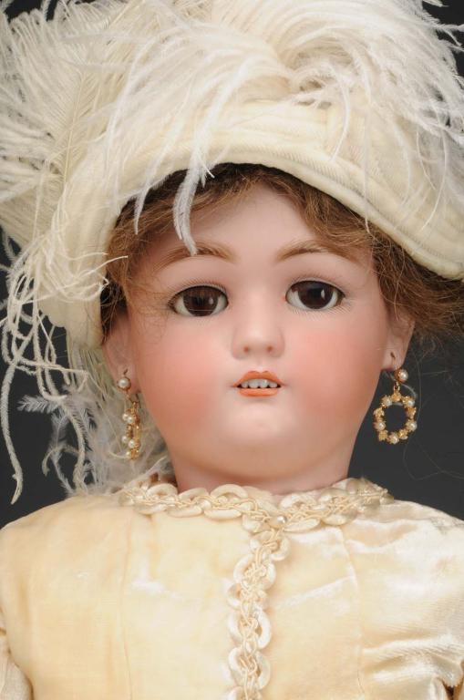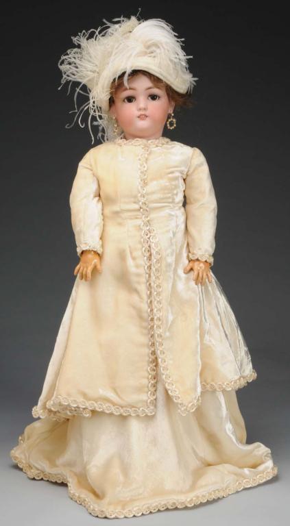 Description Incised "1349 Jutta S&H13" with brown glass sleep eyes, painted upper and lower lashes plus additional silk upper lashes, open mouth with four teeth, original body with original finish, and elaborately dressed as an early 20th century adult lady. Condition (Very Good). Size 28" T.