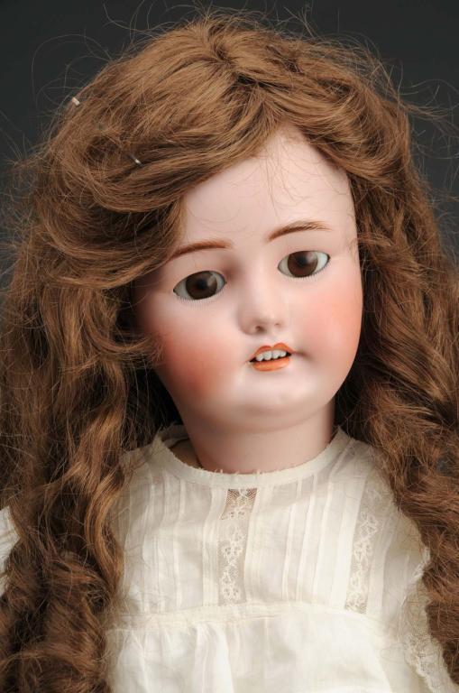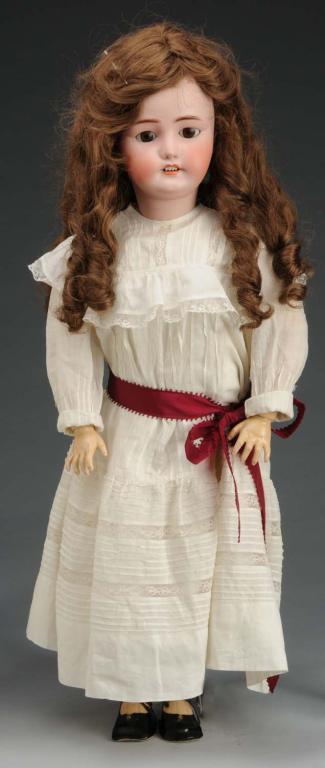 Description Bisque head incised "C.M. Bergmann Simon & Halbig 14 - 1/2". Brown glass sleep eyes, lower painted lashes, open mouth with four upper teeth, and original wood and composition fully-jointed body. Wears a newer brown long curled wig and an old antique white cotton dress with a newer burgundy sash. Doll body has been repainted. Condition (Very Good). Size 32" T.