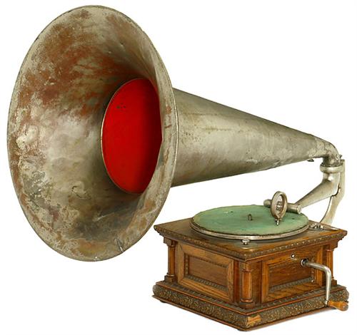 Kaffeehaus-Grammophon mit großem Trichter, um 1910 Unbezeichnet, vermutlich Deutschland, verziertes Eichengehäuse, Maße: 32 x 32 x 18 cm, Doppel-Federwerk, Schalldose "Argentin Concert Soundbox, Schweiz", großer Metall-Trichter (gelötet), Länge: 84 cm. Unrestaurierter Originalzustand. Motor läuft gut!