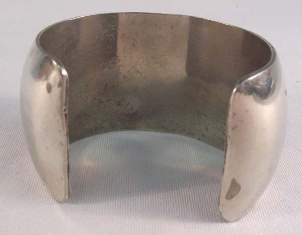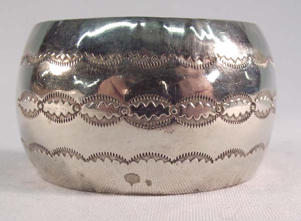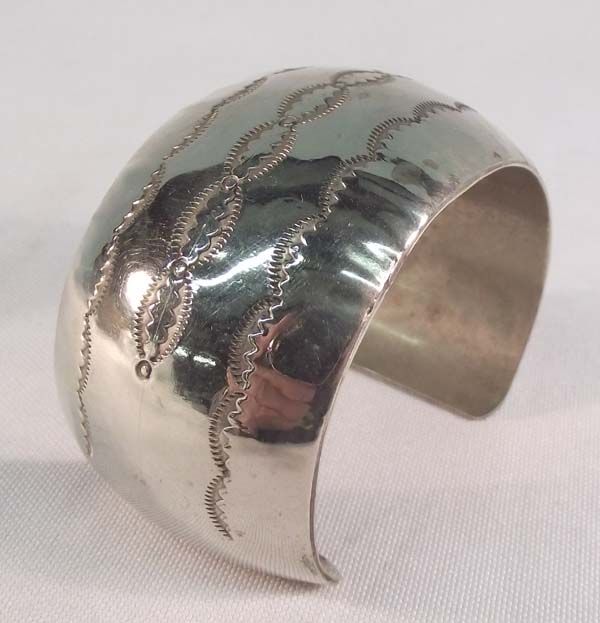 Large German Silver Bracelet. Measures approx. 6 1/2'' x 1 1/2''W, including opening. Nice stamped designs on the outside.