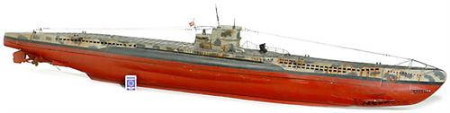 Large German Submarine Model (WWII) Scale 1:45, electrically powered radio-controlled ship model, fibre glass hull with diving planes, rudder, twin three-blade propellers, electric motor and radio control (receiver only), conning tower, deck rails and other details. 64 in. long.<Br>