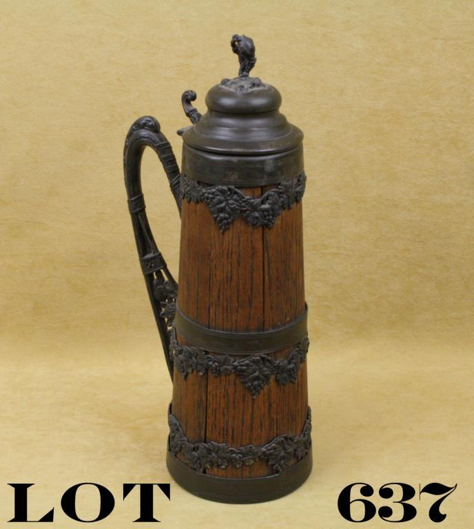 Large German-style wood and metal tankard stein approx. 15-1/2” in height showing an oak body with metal liner, fancy handle and ornate metal overlays and metal lid. This really attractive older tankard is in overall good condition at time of description; bottom of stein is marked “Property of M. Gorton, Liederkranz”; also the name “Russell Sage” and “Nnte Friend” is engraved on the base metal overlay. Interestingly, insidethe metal liner is a typed information paper on Russell Sage (1816-1906) who was a New York capitalist and founder of a college for women and a foundation endowment. Est.: $150-$300.