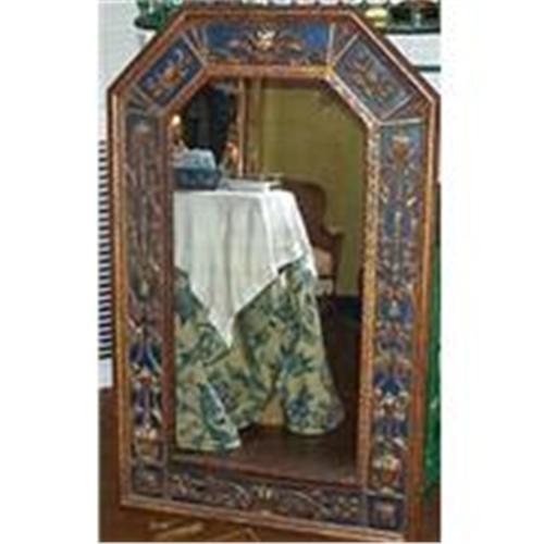 Offered here is a wonderful gesso mirror with raised decoration all along the edge. The top of the mirror is decorated with a cherub and tall baskets of flowers decorate the sides. The ground is a deep blue, actually darker than the flash photo shows. The size is approximately 47" by 30". It is in excellent condition, and dates to early 20th century.