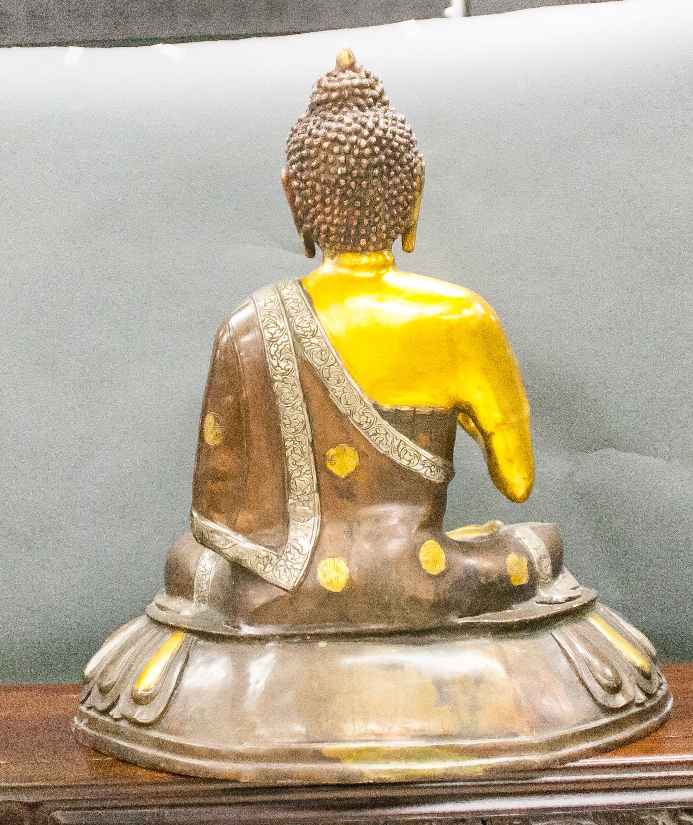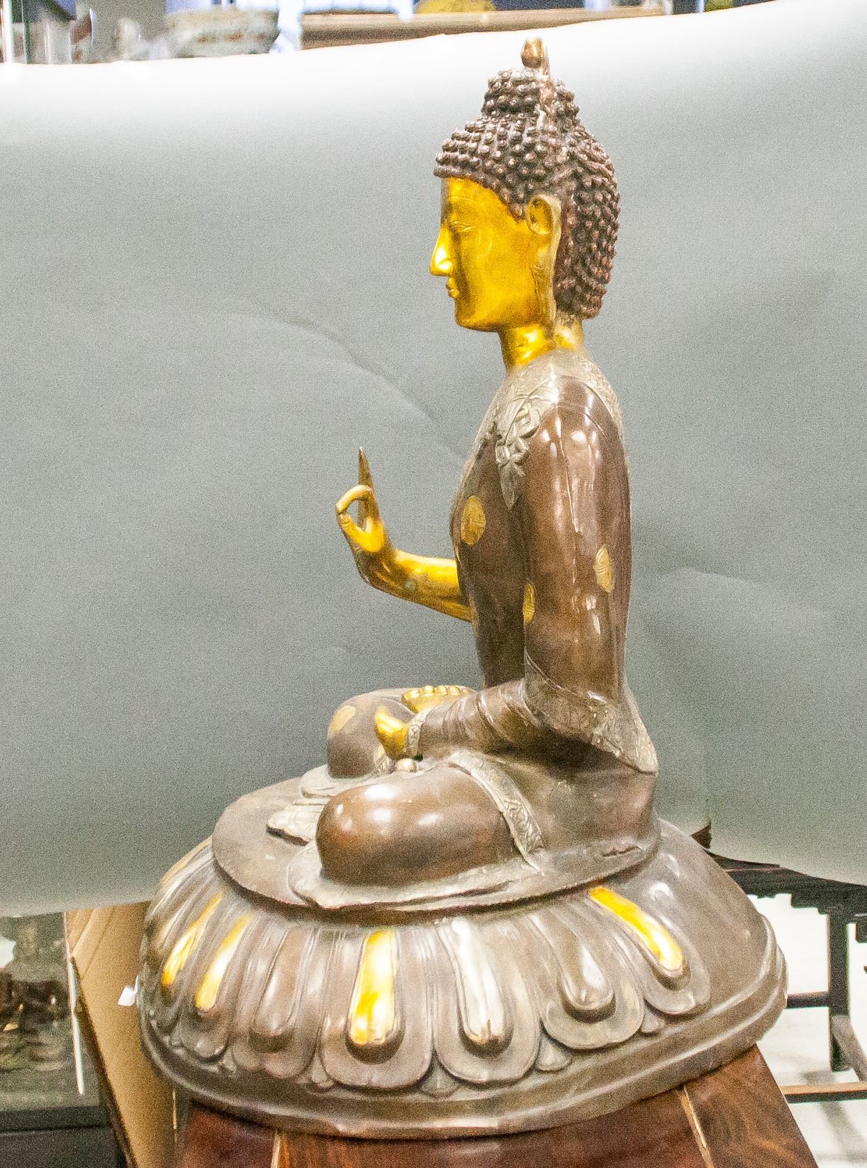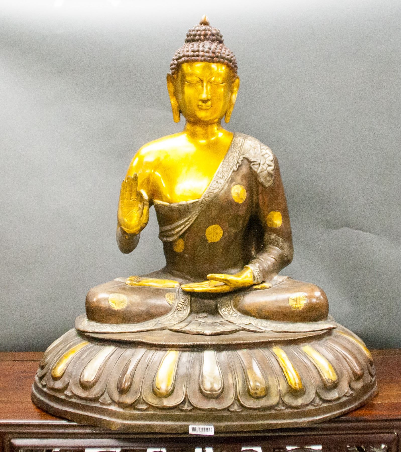 Large Chinese gilt bronze Buddha statue, featuring seated Shakyamuni Buddha on lotus pedal base, left hand in meditation mudra, right hand in dharma chakra mudra, 71 x 59 cm, 25 kilograms