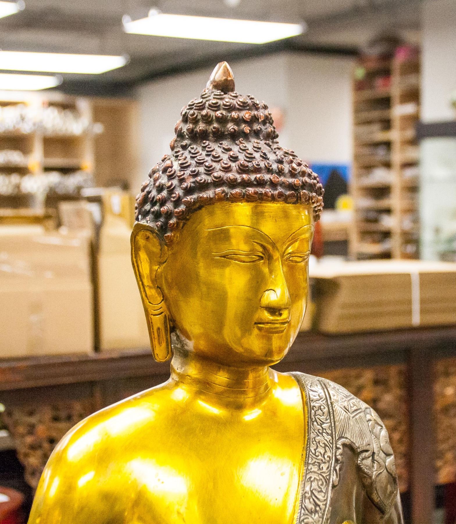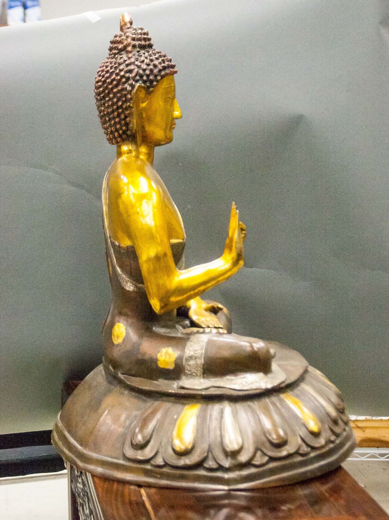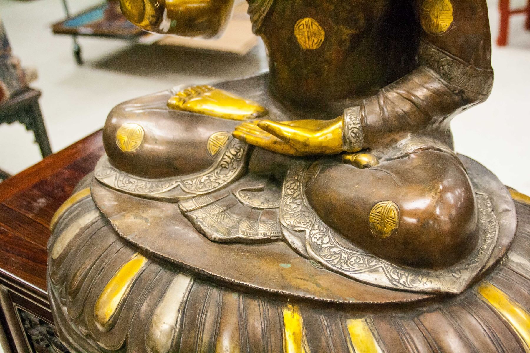Large Chinese gilt bronze Buddha statue, featuring seated Shakyamuni Buddha on lotus pedal base, left hand in meditation mudra, right hand in dharma chakra mudra, 71 x 59 cm, 25 kilograms