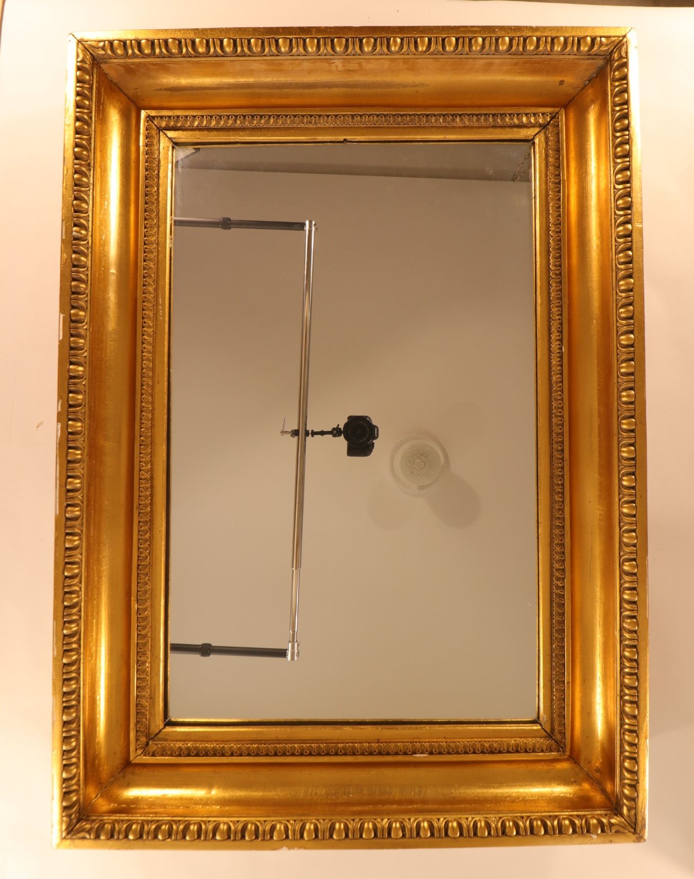 Large rectangular wall mirror in an ornate gilt frame with repeating molded ornament to the inner and outer edges. General wear to gilt surface and frame edges consistent with age and use.