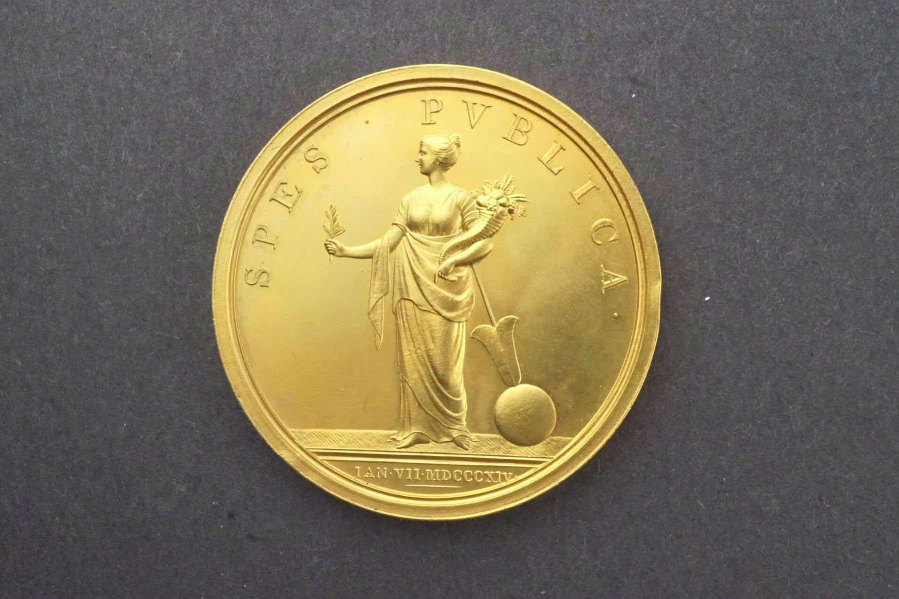 Large Gilt Medal of Charlotte, Queen or Empress, most probably Charlotte of Mecklenburg-Strelitz, the wife of Britain's King George III, and mother of George IV and William IV, Electress of Hanover until Oct. 1814, then Queen Consort of Hannover, 53 mm, 73.5 grams. Heavily gilt. Obverse: CAROLETTA AUGUSTA Bust, right. Signed: J. Webb on truncheon. Reverse: SPES PUBLICA Romanesque figure of Spas (hope) standing, holding branch and cornucopia. In exergue: IAN VII MDCCCXIV