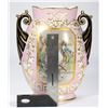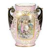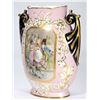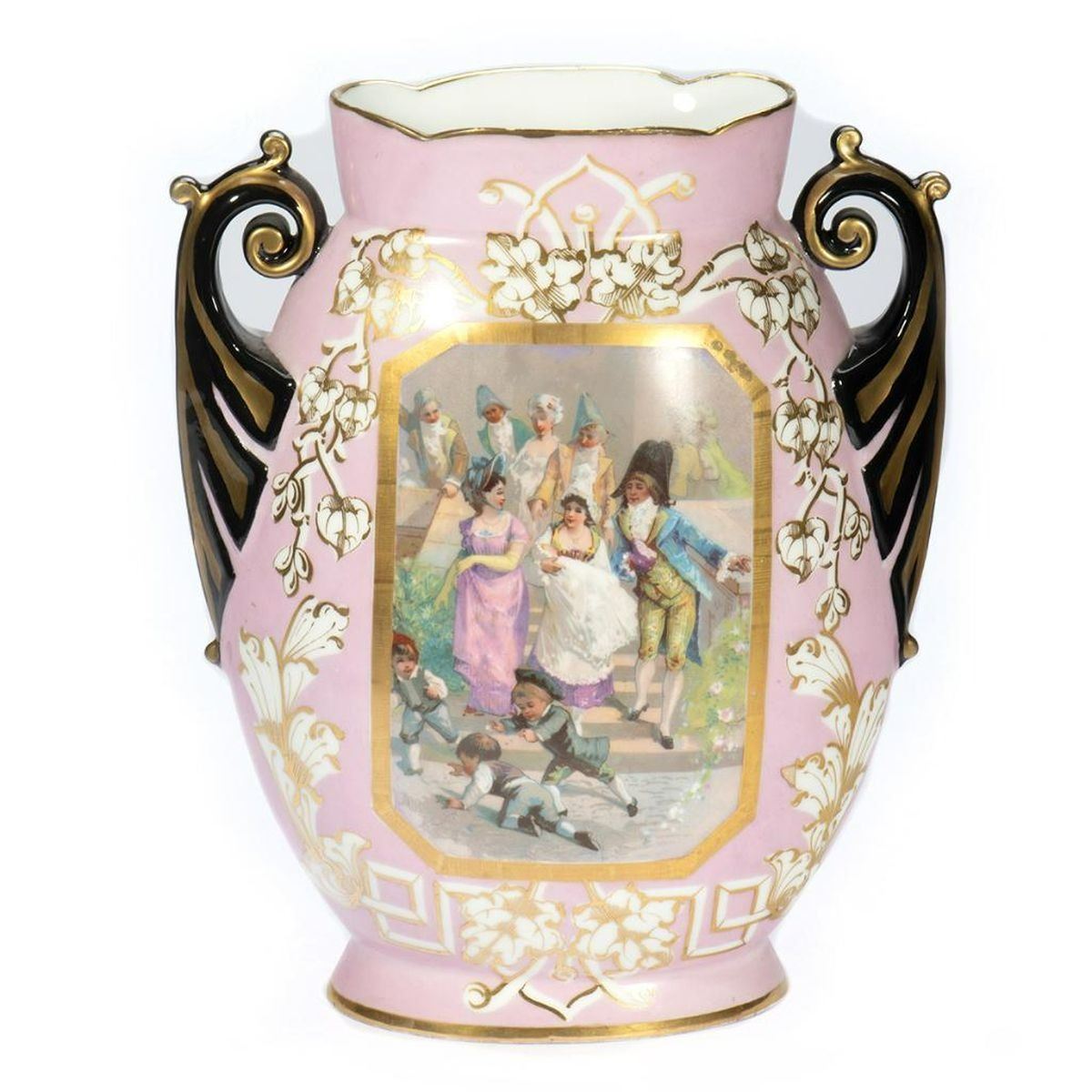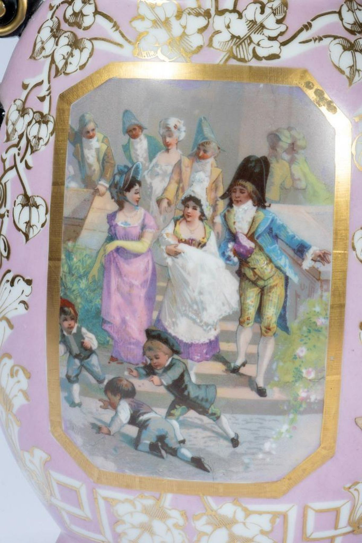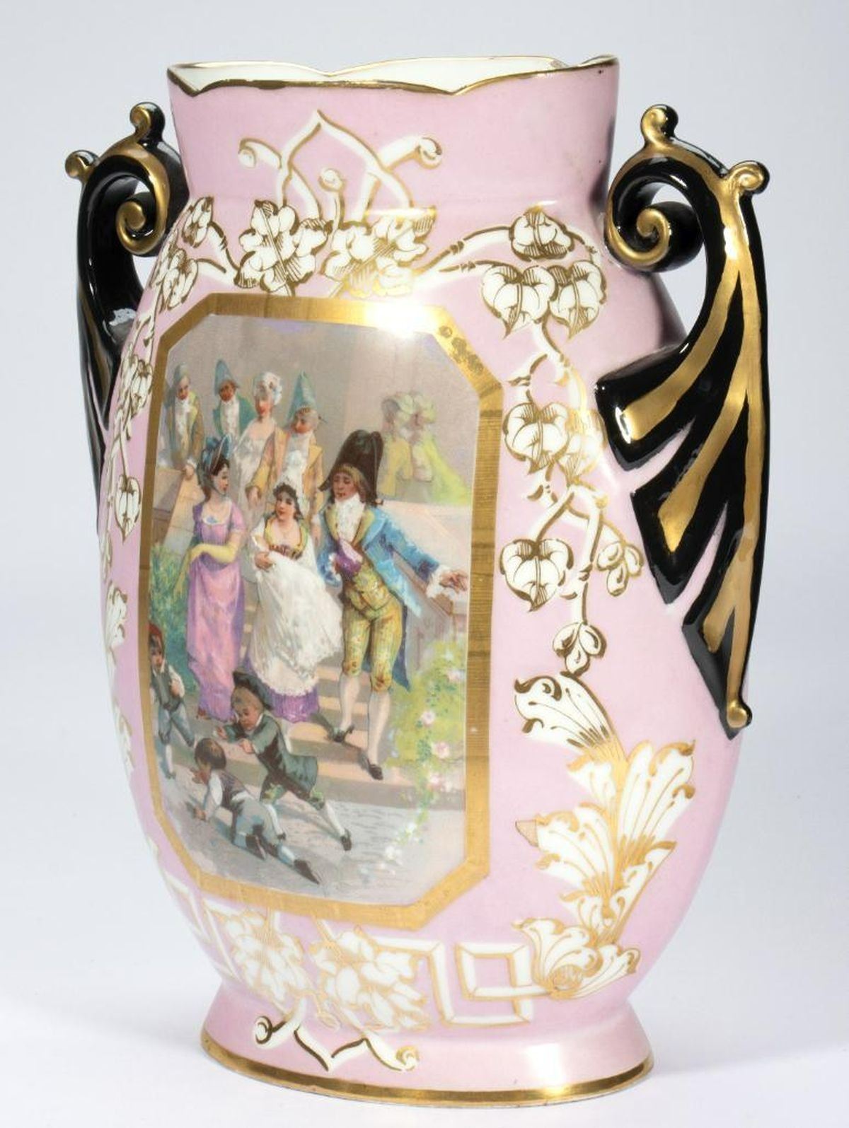 With central 18th century style party scene, and floral decoration on back; unmarked. 12 3/4in. x 11 1/2in. Good condition.