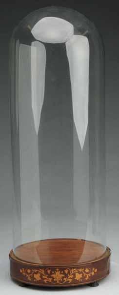 Description Ten-inch diameter sitting on a wood base with inlaid design. Some peeling of veneer on base. Condition (Good). Size 26" T.