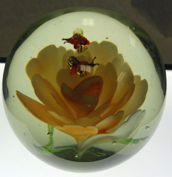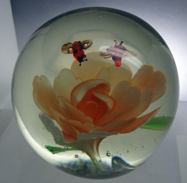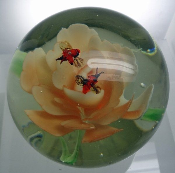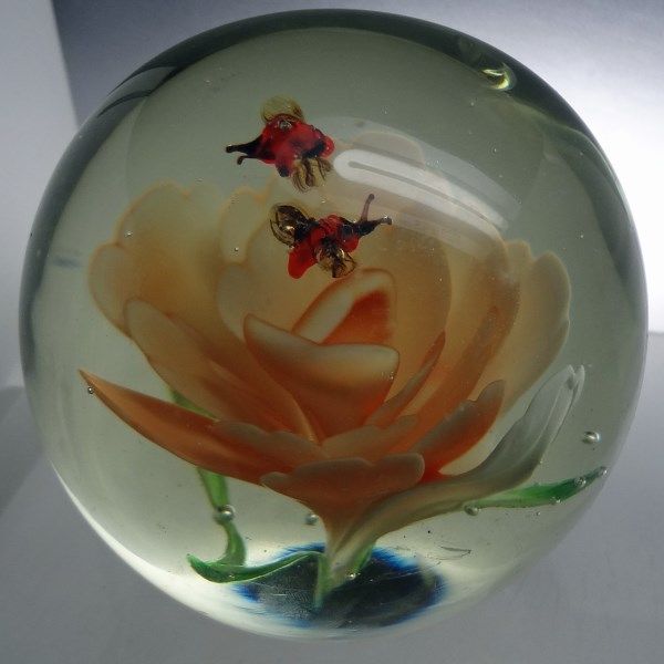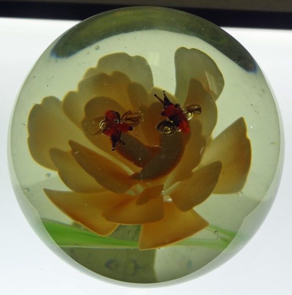 Large glass paperweight with peach flower and two flying bugs inside. Beautiful piece! Est Value $30-50.00