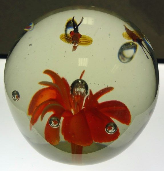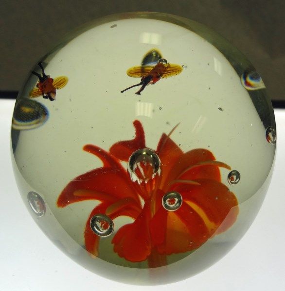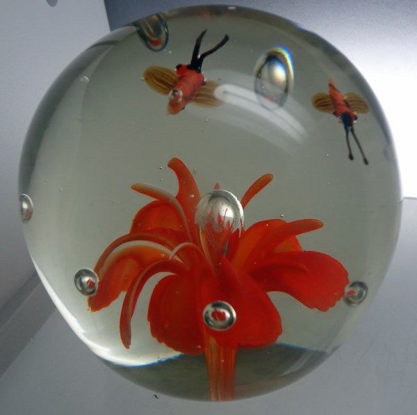 Large glass paperweight with orange flower and two flying bugs inside. Beautiful piece! Est Value $30-50.00