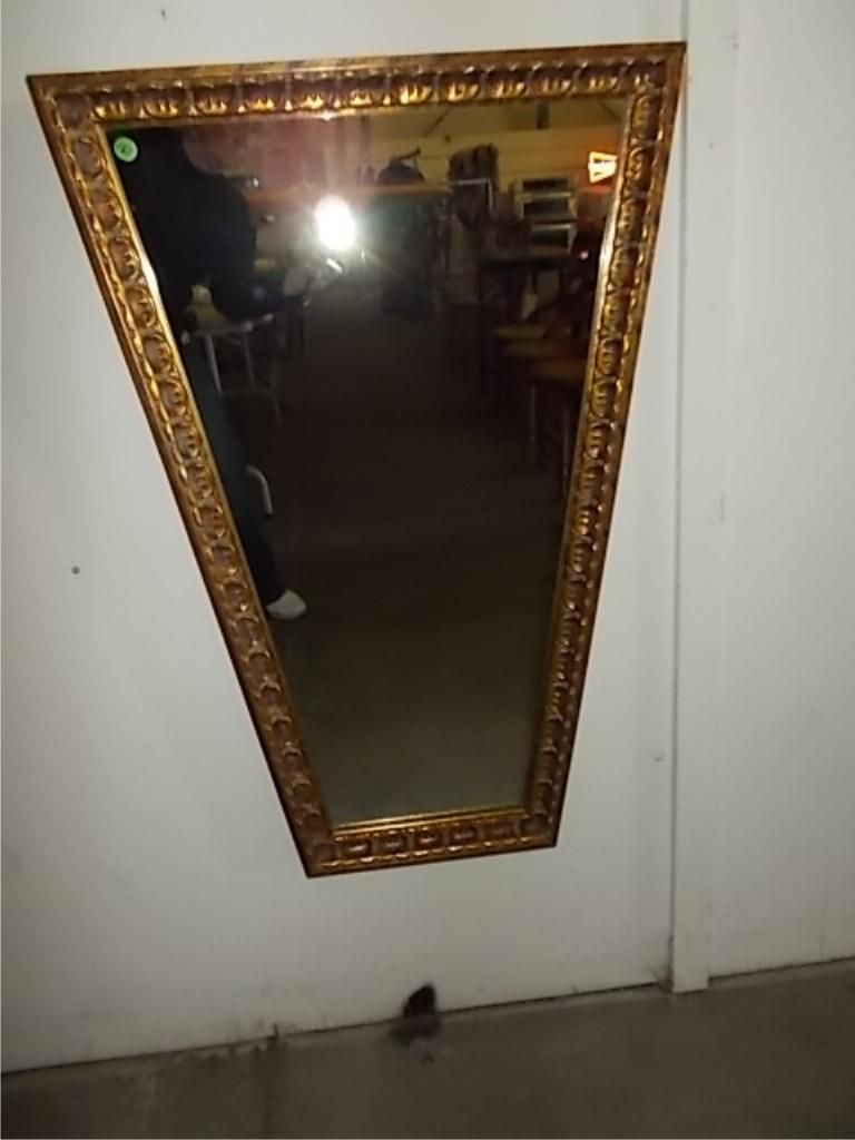 Large Gold Framed Mirror approx top 24" wide x 36" long, bottom 12 1/2" wide