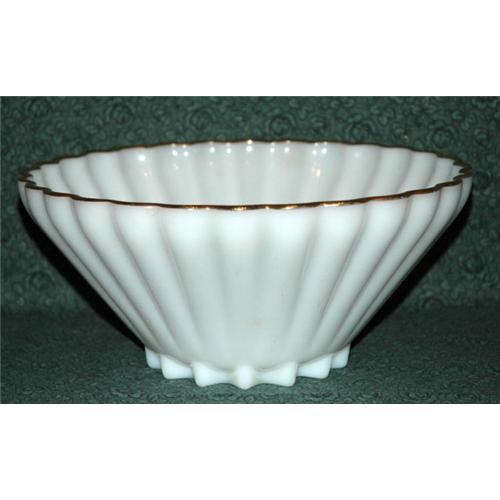 Elegant Golden Shell Milk Glass Salad Bowl. It measures 10 1/2" across and 5" high. It is trimed with gold. The base has a short foot and then fans up from there. It is not marked on the bottom. The condition is excellent. All the gold trim in intact. <p>********************************************************************************************<p>