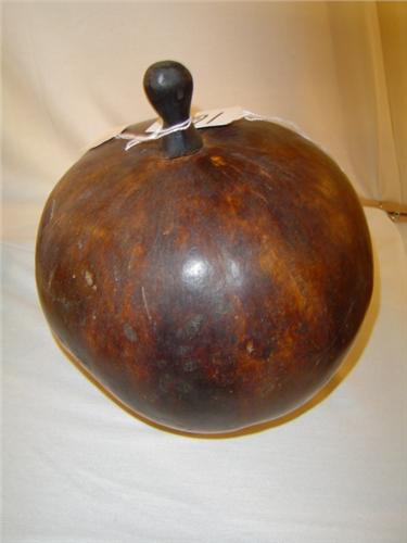 Large Indonesian indigenous gourd container with a carved head & face wood stopper. The gourd is plain and finished with a rich brown stain. It's 7" tall (without stopper) X approx. 8"" in diameter, 9" tall including stopper. Gourd containers were/are used to carry spices, oils, medicines, extracts, etc.