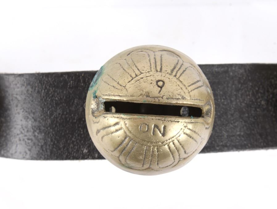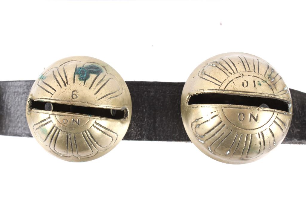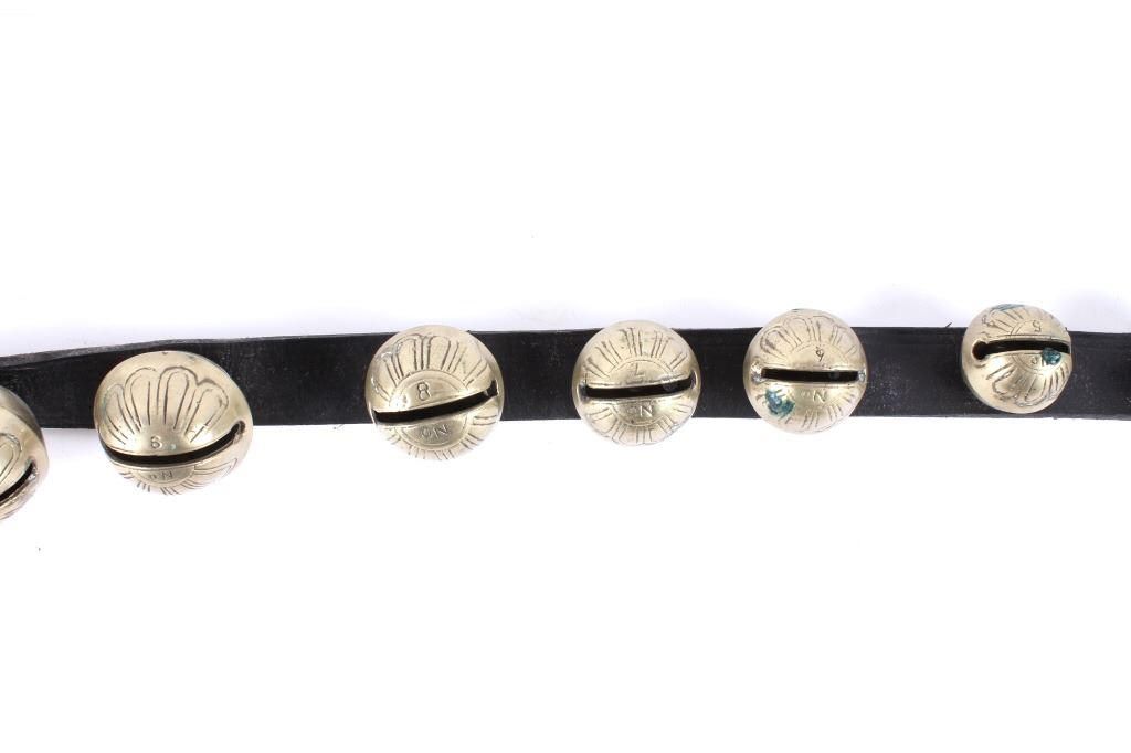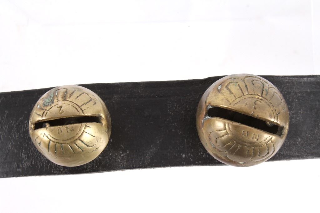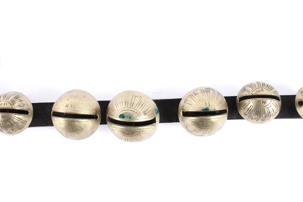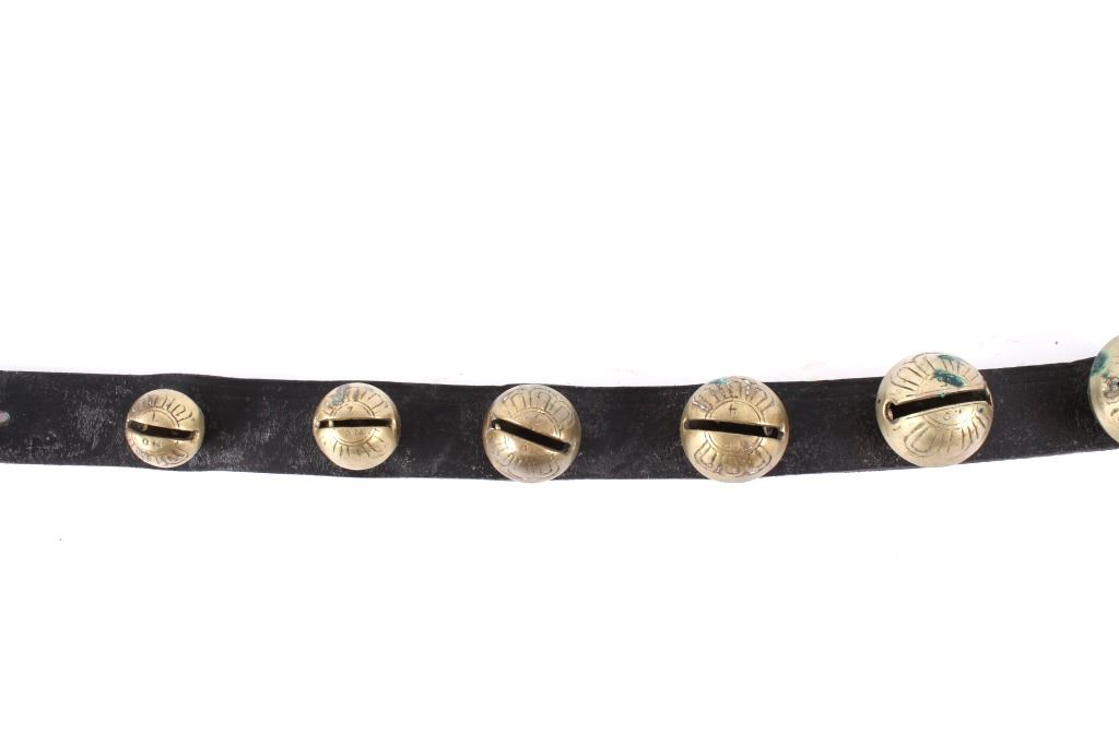 For your consideration is this large graduated brass sleigh bells on harness leather collar. The bells size and type range #12 bells to #1 size bells and are graduated smallest on outside with the largest bells in the center. There are 23 bells in total on this harness leather collar. The condition of this of this sleigh bell collar is good with no obvious signs of damage and shows heavy patina in areas on the brass bells. The measurements of this of this sleigh bells 80" x 3".