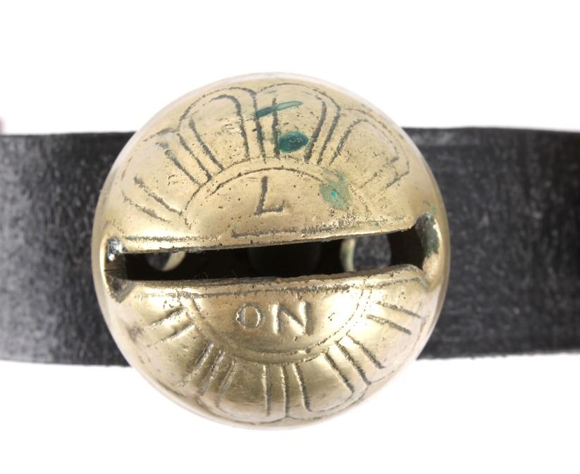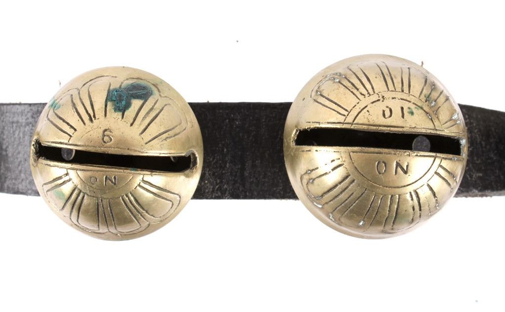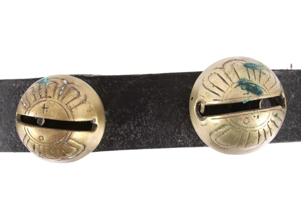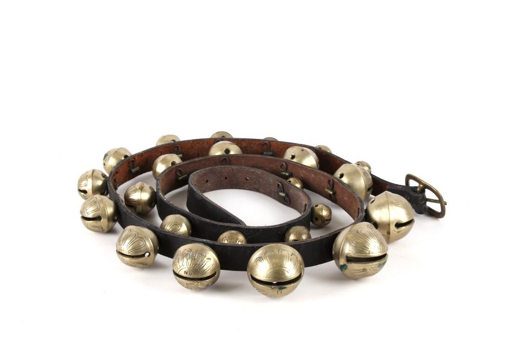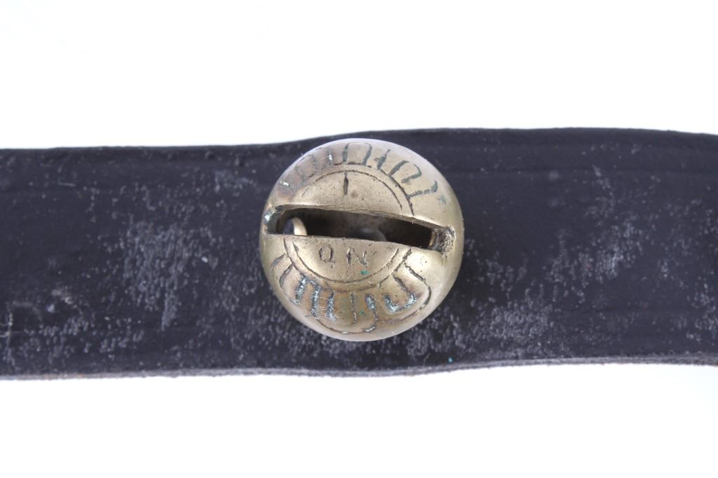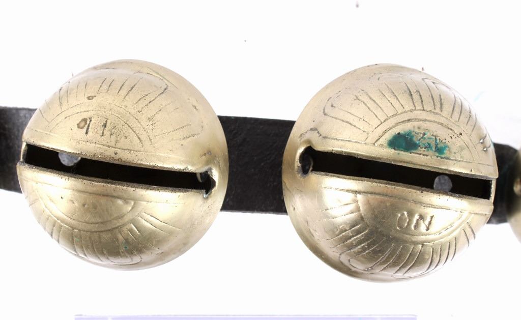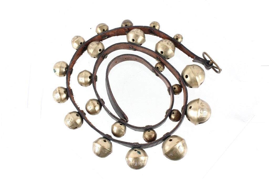 For your consideration is this large graduated brass sleigh bells on harness leather collar. The bells size and type range #12 bells to #1 size bells and are graduated smallest on outside with the largest bells in the center. There are 23 bells in total on this harness leather collar. The condition of this of this sleigh bell collar is good with no obvious signs of damage and shows heavy patina in areas on the brass bells. The measurements of this of this sleigh bells 80" x 3".