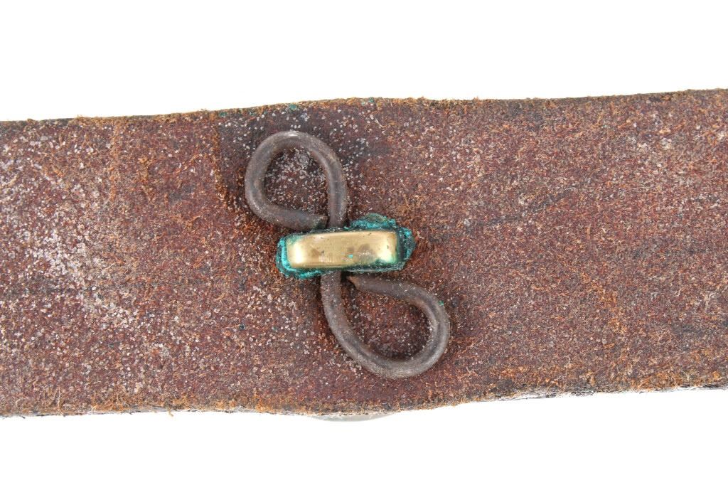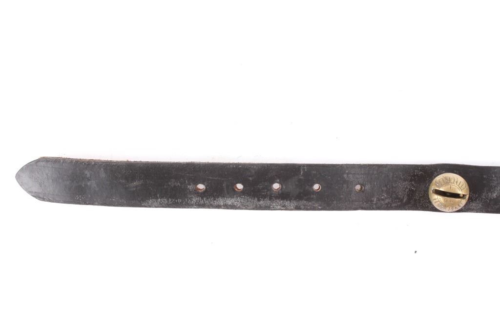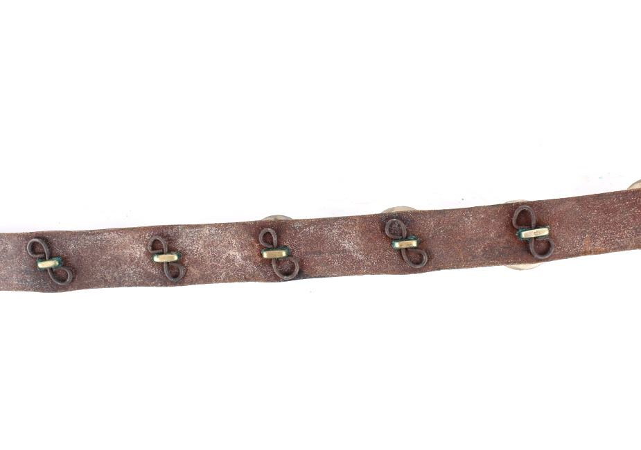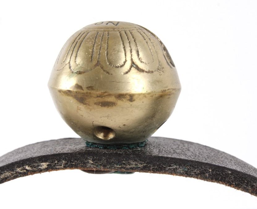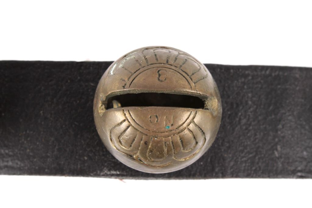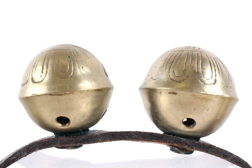 For your consideration is this large graduated brass sleigh bells on harness leather collar. The bells size and type range #12 bells to #1 size bells and are graduated smallest on outside with the largest bells in the center. There are 23 bells in total on this harness leather collar. The condition of this of this sleigh bell collar is good with no obvious signs of damage and shows heavy patina in areas on the brass bells. The measurements of this of this sleigh bells 80" x 3".