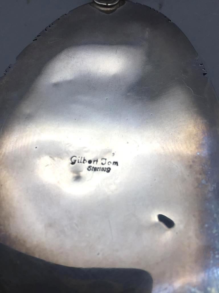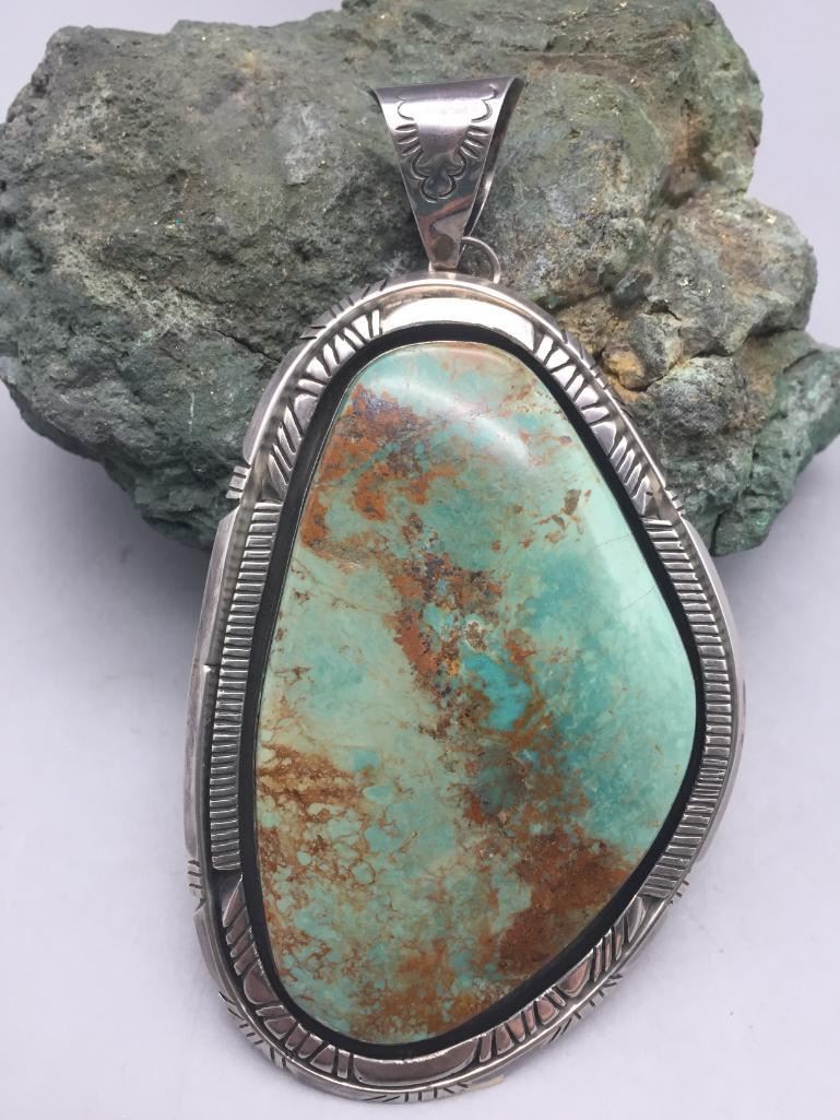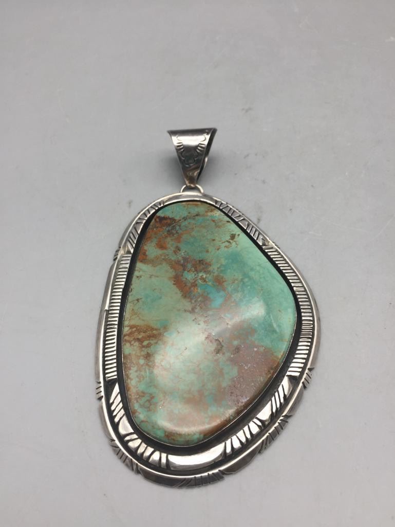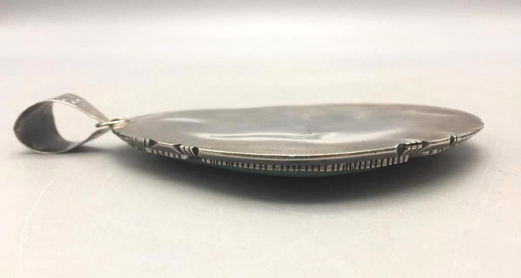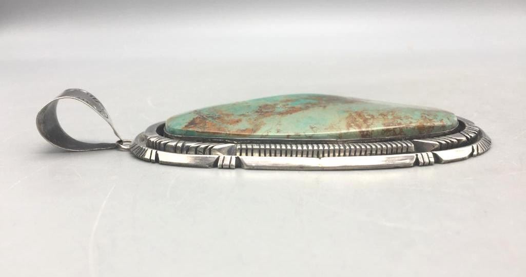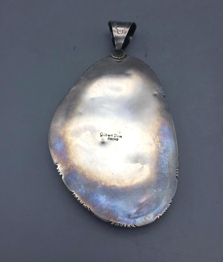 Presented for sale in this lot is a nice, large, green stone turquoise pendant with sterling silver accents. Maker: Gilbert Tom, Navajo. Approx. Age: Contemporary. Size: 5" long x 2-5/8" wide. Weighs 102.7 grams. Condition: Good for its age, normal wear expected. Please look closely at the pictures - they are an important part of our description. Shipping: There will be a $5 handling, packaging fee for shipping this lot. The actual cost of postage will be added on top of that.