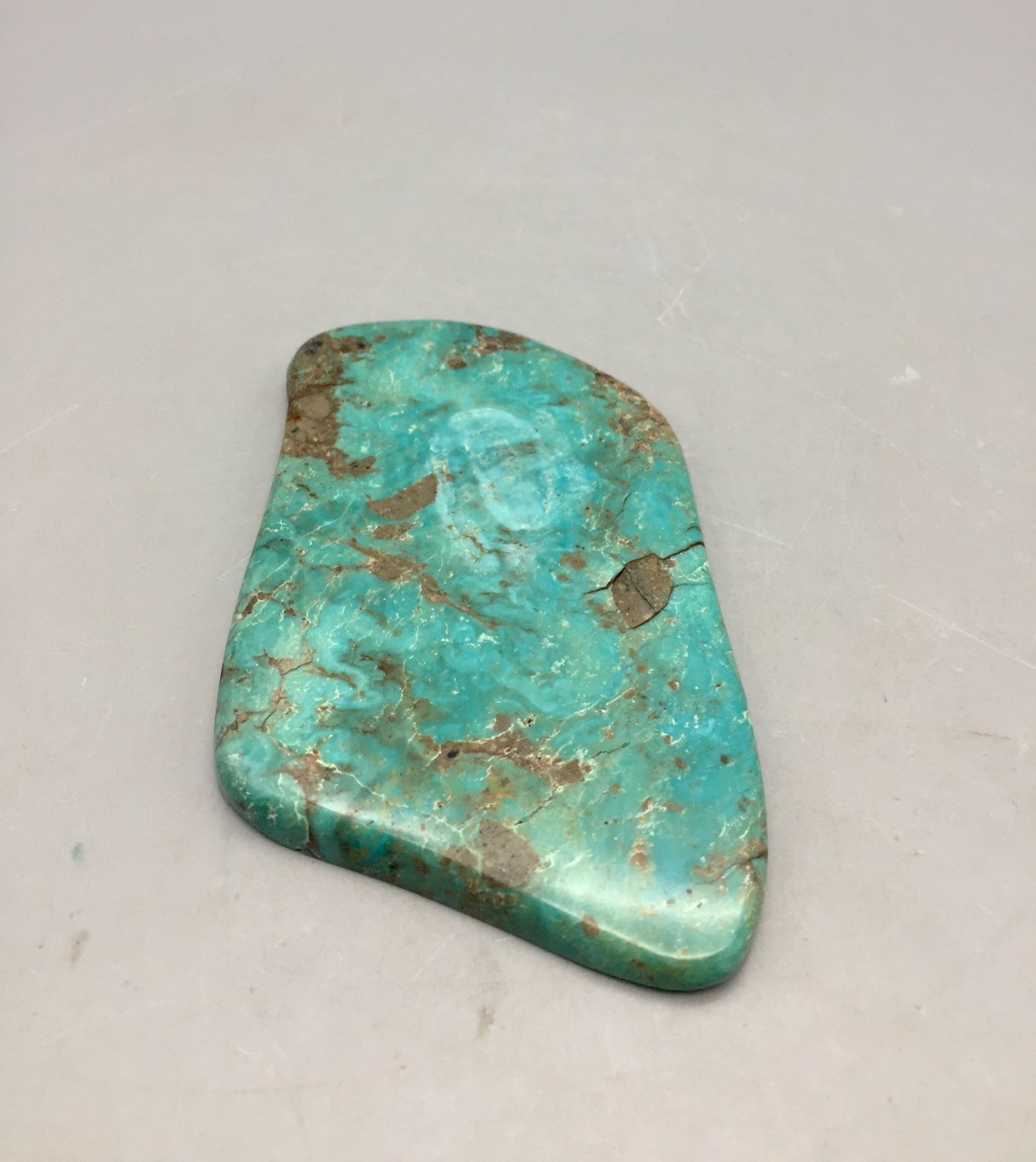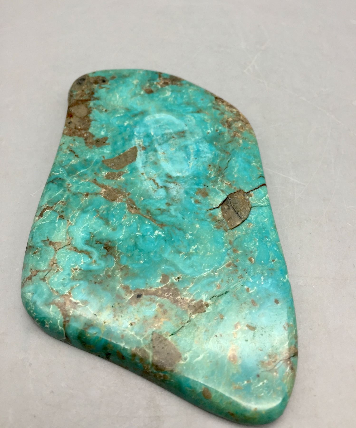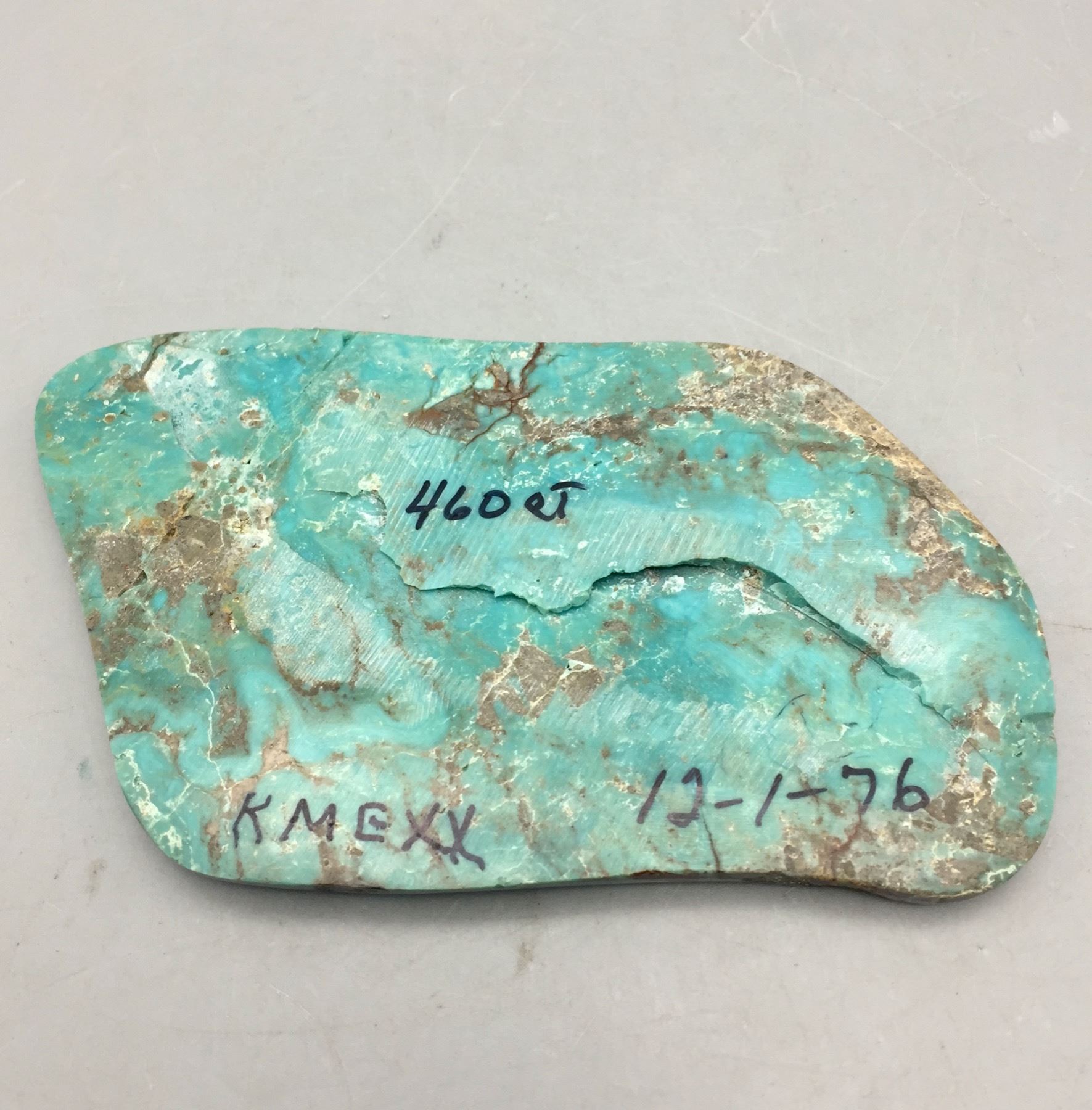 Description: For sale in this lot we have a beautiful and large size turquoise cabochon. It is ready to be turned into a beautiful project or is collectible on its own as such a large single stone! Maker: Unknown mine. Approx. Age: There is a date of 1976 on the back. This may be when is was cut. Size: Weighs 460 carats. Condition: Good for its age, imperfections expected. Please look closely at the pictures - they are an important part of our description. Shipping: There will be a $7 handling, packaging fee for shipping this lot. The actual cost of postage will be added on top of that.