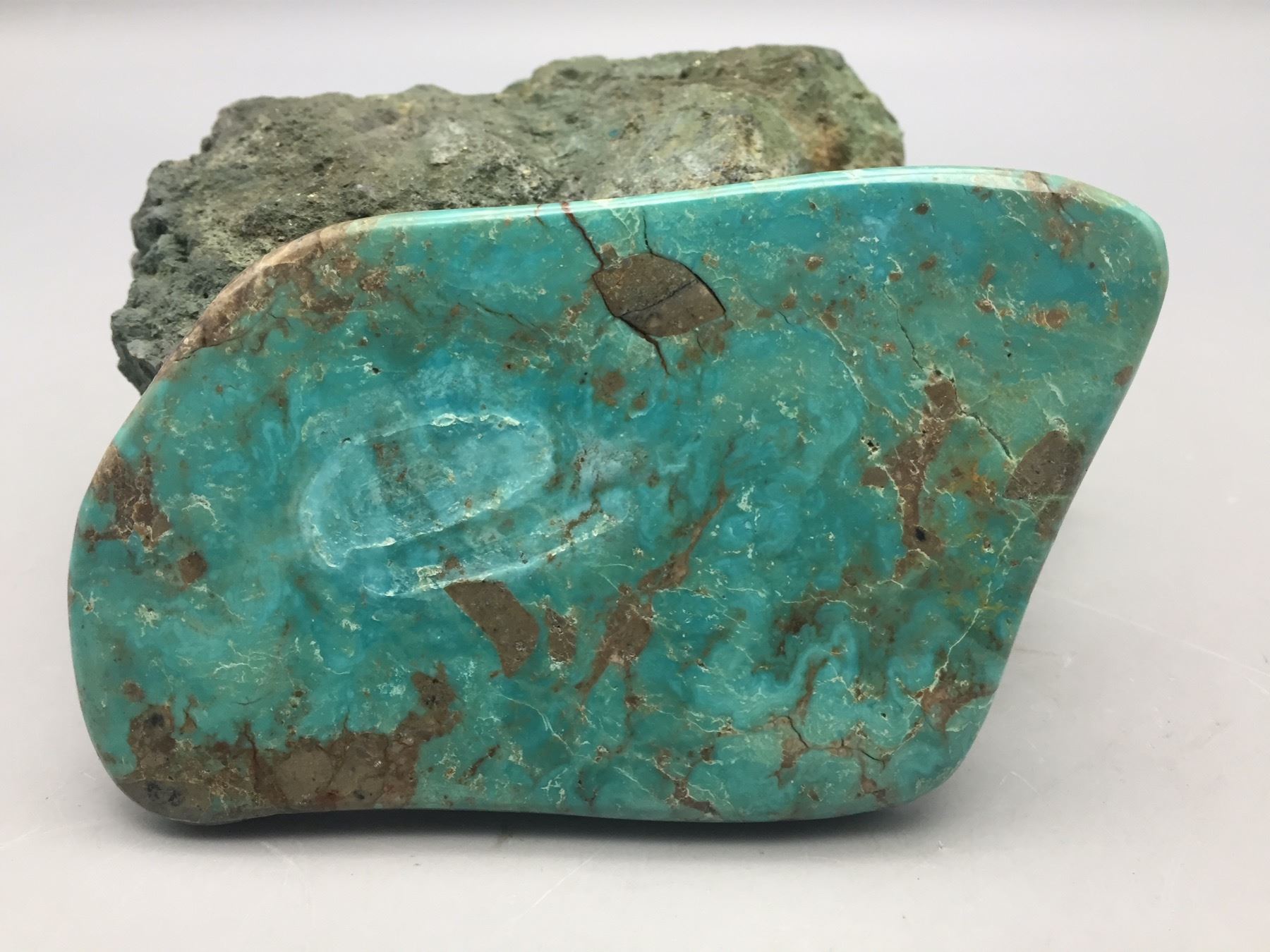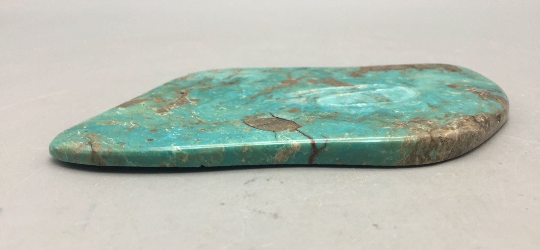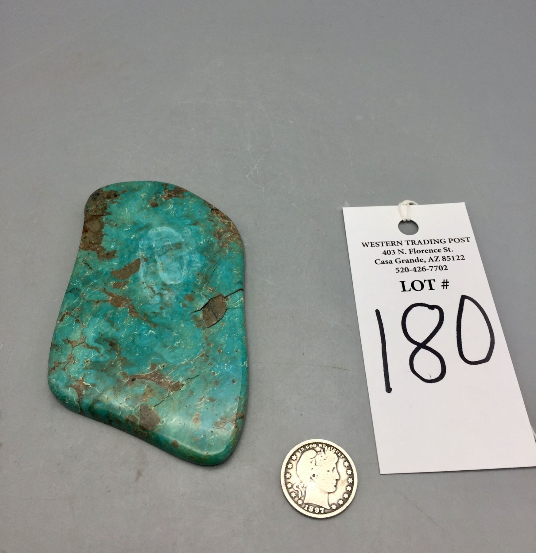 Description: For sale in this lot we have a beautiful and large size turquoise cabochon. It is ready to be turned into a beautiful project or is collectible on its own as such a large single stone! Maker: Unknown mine. Approx. Age: There is a date of 1976 on the back. This may be when is was cut. Size: Weighs 460 carats. Condition: Good for its age, imperfections expected. Please look closely at the pictures - they are an important part of our description. Shipping: There will be a $7 handling, packaging fee for shipping this lot. The actual cost of postage will be added on top of that.