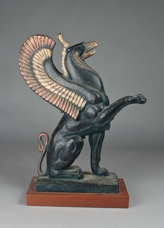 Large plaster griffin painted in metallic and black, attached to wooden base. 21.5" H x 12.75" L x 7" W. Small flea chips and surface grime.