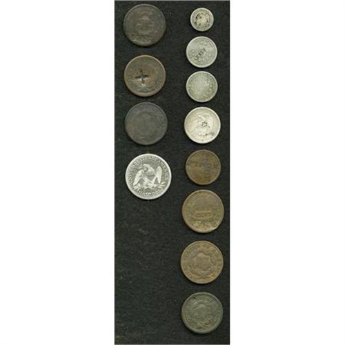 <B>12-Piece Counterstamped Coins Lot.</B></I> Silver/copper. A diverse lot of U.S. type coins, from large cents to a Seated Liberty half dollar, all with some form of counterstamp.<BR><BR><b>Shipping:</b> Coins & Currency (<a target="_blank" href="http://www.heritageauctions.com/common/shipping.php">view shipping information</a>)
