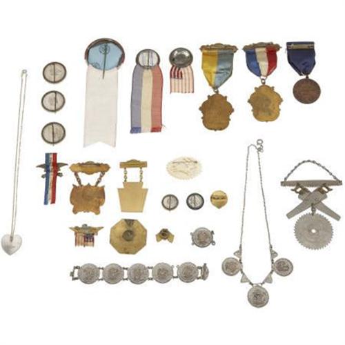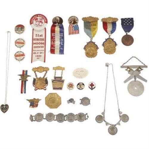 <B>Large Group of 20 Assorted Pennsylvania Badges, Pins, and Ribbons from the Early 1900s Through World War II</B></I>. A large grouping of 20 assorted pins, medals, badges, and ribbons. Included are badges from the Patriotic Order Sons of America.; an 1876 badge and ribbon for the Centennial Legion of Historic Military Commanders; a centennial button for Dickinson College 1901; two pins for Williamsport, Pennsylvania; a 1939 Moose Convention badge and a World War II Red Cross enamel pin.<BR><BR><b>Shipping:</b> Flat Material, Small (<a target="_blank" href="http://www.heritageauctions.com/common/shipping.php">view shipping information</a>)