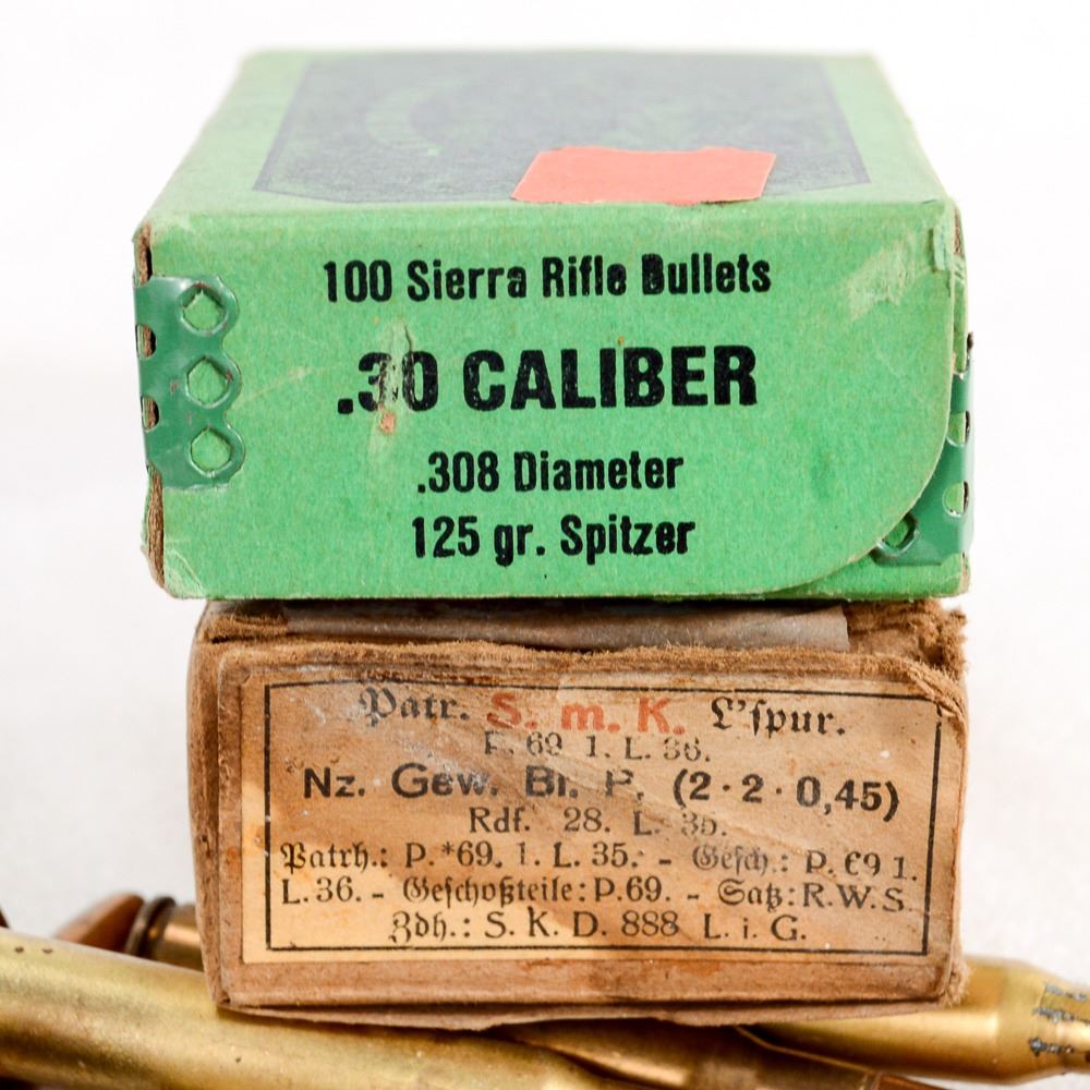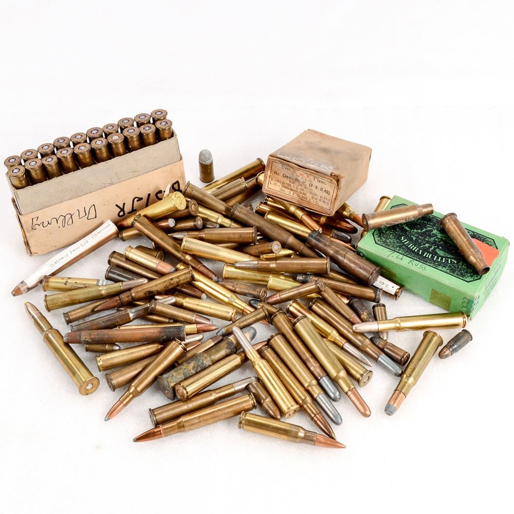 Includes 15 rds WWII German 8mm armor Piercing in box. 9.3X72D Norma, 30 Gov 1906 Western, 38X55 REM-UMC, 32-40win Peters, 2rds 30 Luger, 3rds 7.62russ Norma, 5rds 41long REM-UMC, 303 British Adapter Kynoch, 577/450 Martini Henry paper patch, No1 Gibbs shell, 240mag rimless Kynoch, 318 Westley Richard, 375mag Hollands flanged, 450/400 Bell, and much more.