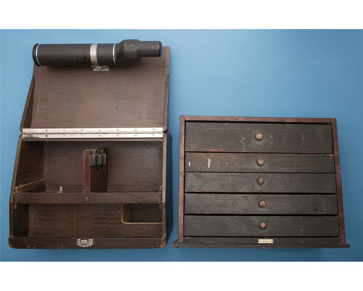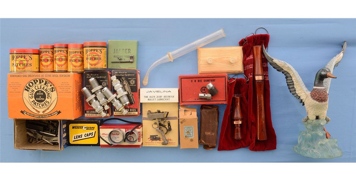 Two wooden duck calls with stand, one magazine, reloading tools, Weaver scope lens cap for model K8 or K10, box of miscellaneous gun parts, Javelina beeswax bullet lubricant, box of Ideal gas checks for .32 or 8mm, duck statue, 6 boxes and 5 jars of Hoppe's gun cleaning patches, Lyman sight box (empty), shooters box and spotting scope, and metal display case. CONDITION: Good overall.