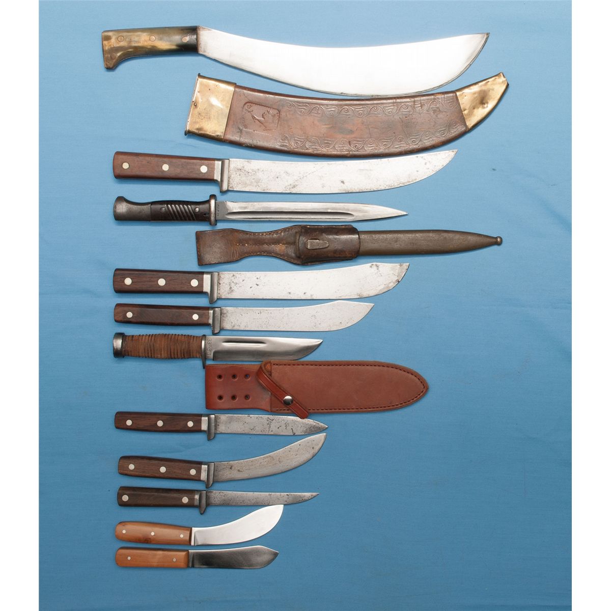 1) Collins & Co. Hartford Bolo machete with a 15 inch blade and leather sheath 2) Knife with a 12 inch blade. 3) Bayonet with metal scabbard. 4) Knife with a 10 inch blade. 5) Knife with an 8 inch blade. 6) WWII CASE XX 337 fighting knife with a 6 inch blade and Randall sheath. 7) Knife with 6 inch blade. 8) Knife with a 6 inch blade. 9) Knife with a 6 inch blade. 10) Knife with a 5 inch blade. 11) Knife with 4 ¾ inch blade. CONDITION: Good or better overall.