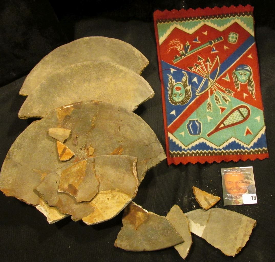 Large Group of Native American Pottery Shards & Old tobacco Flannel with Indian Motif