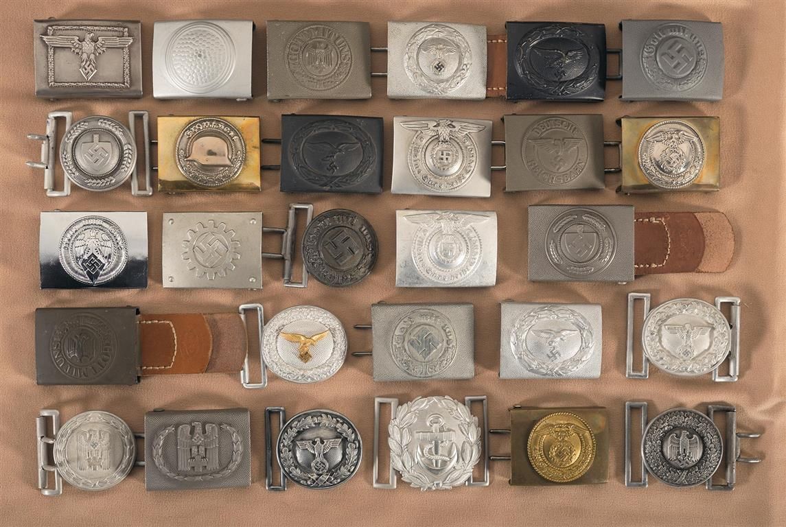 This lot includes twenty rectangular profile belt buckles and eight round profile buckles. The rectangular buckles include examples from the RAD, German Red Cross, Hitler Youth, German Railways, Heer, Luftwaffe and SS, and the round buckles include RAD, Kriegsmarine, Red Cross, Heer and Luftwaffe examples.