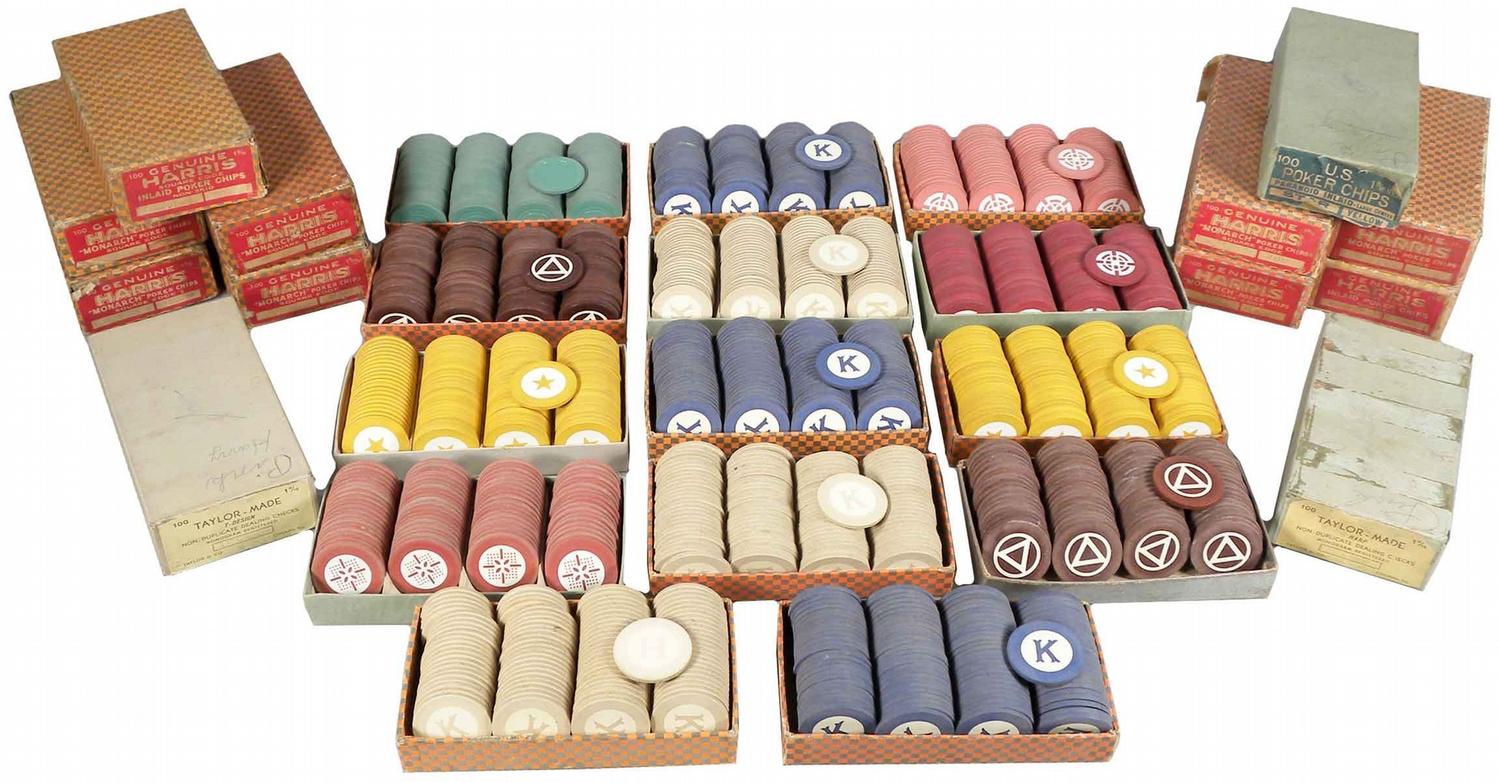 Large Group of Poker Chips in original boxes. Genuine Harris and Taylor Made brands. Some inlaid and some plain with various colors. Approx. 1,200 total. Excellent Condition.