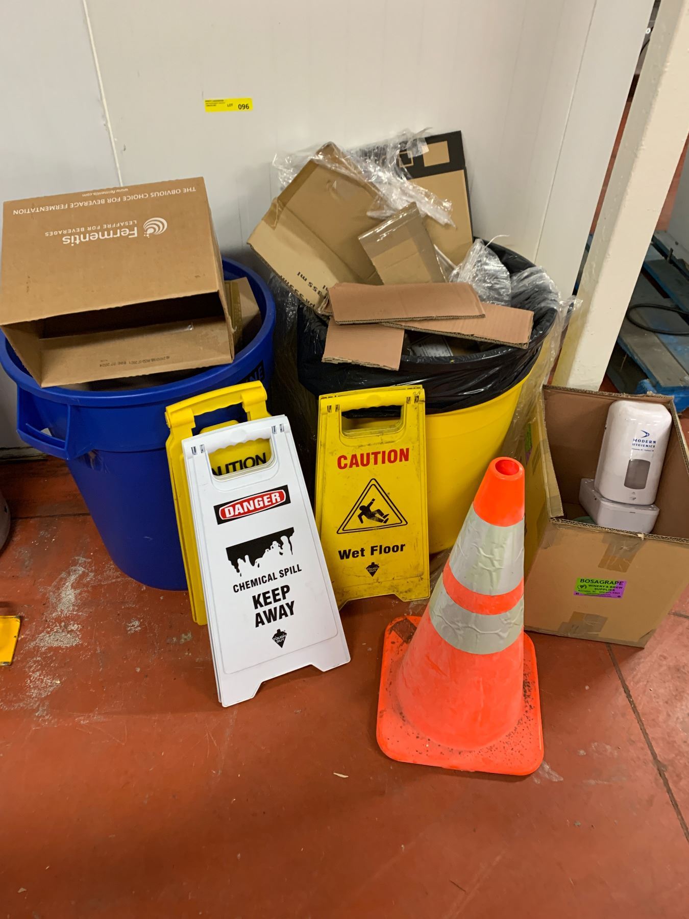 Large Group of misc. - Includes Two Wet floor Signs/ Chemical spill sign/Two ULINE bins/Three Autom