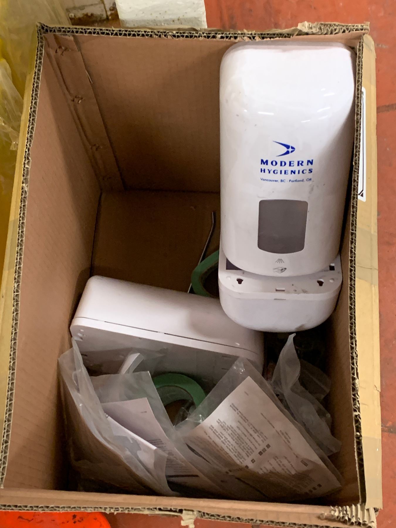 Large Group of misc. - Includes Two Wet floor Signs/ Chemical spill sign/Two ULINE bins/Three Automatic Hand sanitizer