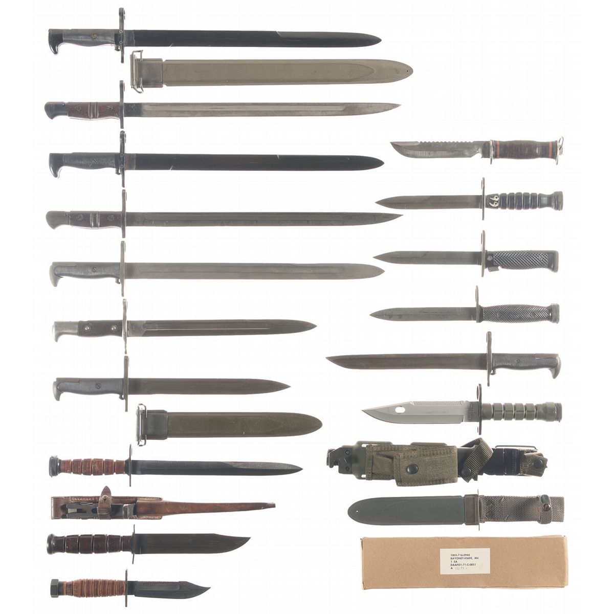 1 dark green M9 bayonet with sheath in packaging with instructions (sheath has pouch on the front and sharpening stone on back), 1 tan M10 bayonet in packaging with instructions, 1 M4 bayonet in box and packaging, 1 Johnson bayonet with sheath, 1 M7 bayonet, 1 Imperial M6 bayonet, 1 M4 bayonet, 1 M4 style bayonet marked "KIFFE/JAPAN", 1 M1892 bayonet, 1 1917 dated Remington M1917 bayonet, 1 1918 dated Remington M1917 bayonet, 1 1943 dated M1905 16" bayonet, 2 U.S.N. Mark 1 plastic training bayonets with 1 sheath, 1 U.F.H M1905 bayonet with sheath, 1 1942 dated A.F.H M1905 bayonet with mismatch sheath marked "U.S./L.F&C.-1918", 1 Camillus pilot knife with sheath and sharpening stone, 1 KA-BAR U.S.N. Mark 2 knife with sheath and 1 E.G.W. Knife.