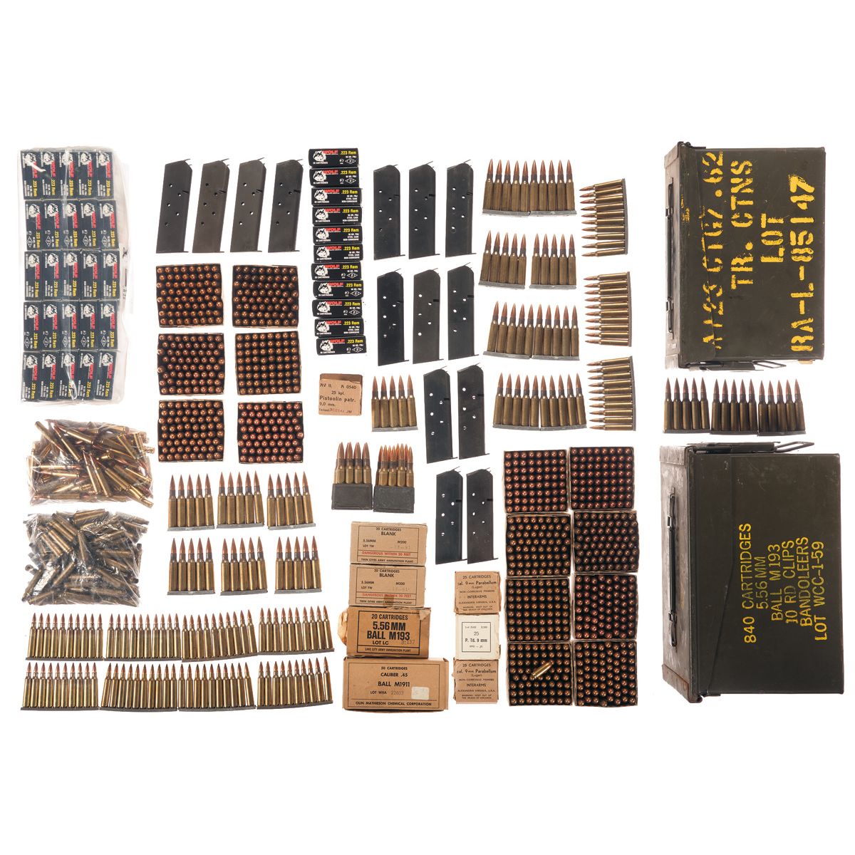 38 boxes Wolf .223 Rem (20/20), 60 boxes 9mm (3714 rounds), 3 boxes Twin Cities Army Ammunition Plant 5.56mm blank (20/20), Lake City Army Ammunition plant 5.56 mm M193 (20/20), Gun Mathieson Chemical Corp. 45 ACP M1911 (28/5), 2 clips 30-06 (16 rounds), 61 10-round clips 223mm, 87 rounds of 223mm, 112 223mm casings, 84 5-round clips of unidentified cartridges (likely 7.62mm), with 39 Model 1911 pistol magazines. All counts are estimates.