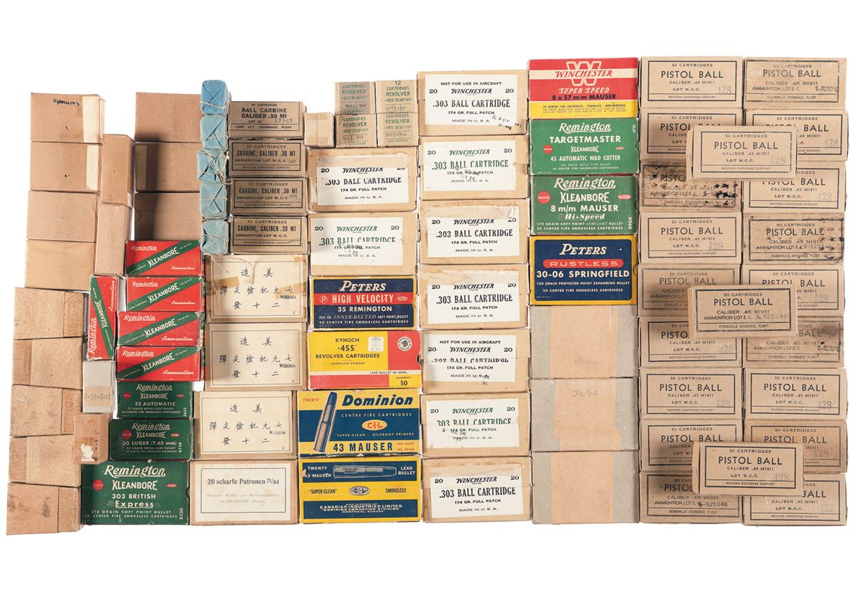 Lot contains 4 boxes (200rds) 30 M1 Carbine, 21 (1050rds) U.S. 45 ACP, 6 (110rds) 455 Eley, 1 (50rds) 45 ACP Wadcutter, 1 (20rds) 35 Remington, 1 (20rds) 8mm Mauser plus 1 partial box, 9 (180rds) 303 Winchester plus 1 partial box, 3 (60rds) 43 Mauser, 1 (20rds) 30-06 plus 3 boxes of unknown quantity, 3 sealed boxes with Japanese markings, 5 sealed boxes with German markings, 5 sealed paper packs devoid of markings, 2 (100rds) 32-20 Winchester, 1 (50rds) 32 Short Colt, 1 (50rds) 32 ACP, 1 (50rds) 30 Luger, 1 (50rds) 9mm Parabellum, 3 (150rds) 38 Special, and 11 (165rds) 8mm Mauser dummy cartridges.