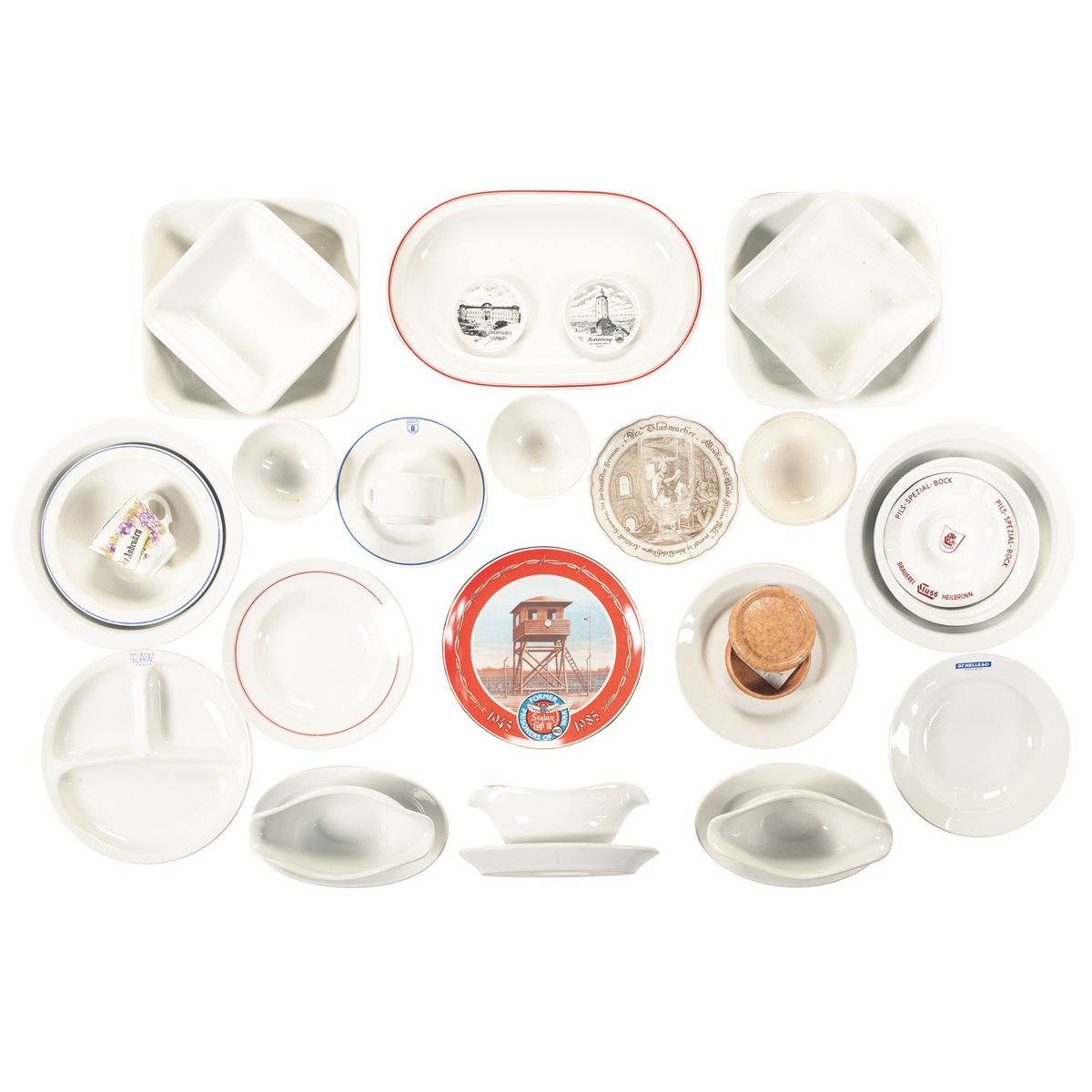 Large number are Nazi marked. 5 gravy boats, 7 platters, 1 German military lard container, 9 rectangular serving dishes, 13 circular serving dishes and bowls, 1 teacup, 2 saucers, 1 ashtray, 2 coffee cups, 16 plates of various sizes and one hat box. All counts are approximations.