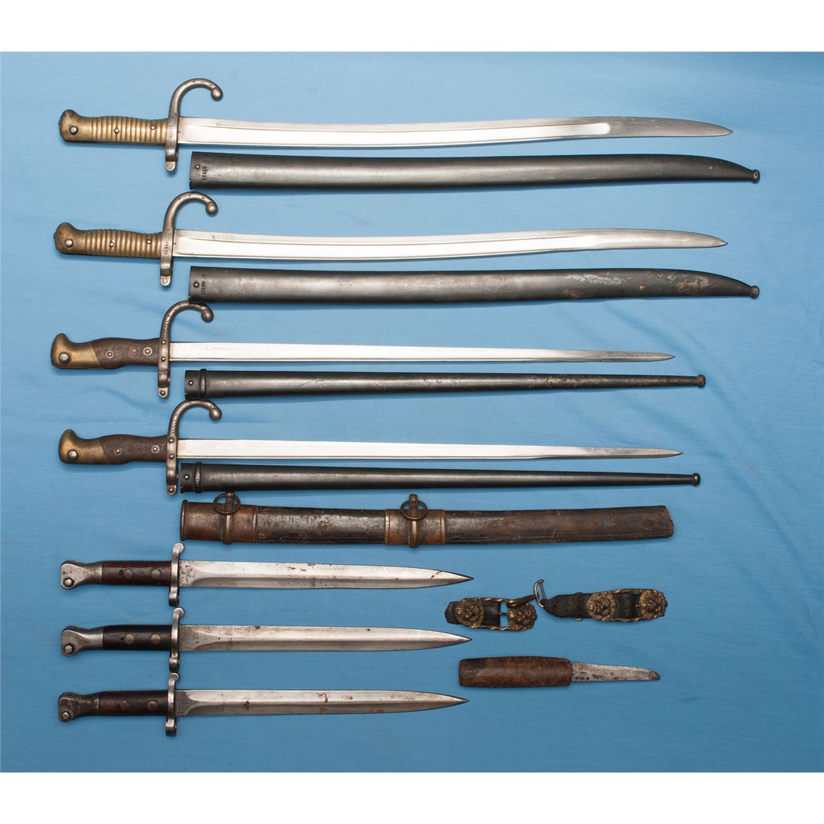 1) Bayonet with a 22 3/4 inch blade and metal scabbard. 2) Bayonet with a 22 3/4 inch blade and metal scabbard. 3) Bayonet with a 20 1/2 inch blade and metal scabbard. 4) Bayonet with a 20 3/4 inch blade and a metal scabbard. 5) Leather scabbard. 6) Bayonet with a 12 inch blade. 7) Bayonet with a 12 inch blade. 8) Bayonet with a 11 3/4 inch blade. 9) Two lions head belt buckles. 10) Knife with a 3 3/4 inch blade. CONDITION: Fair or better overall.