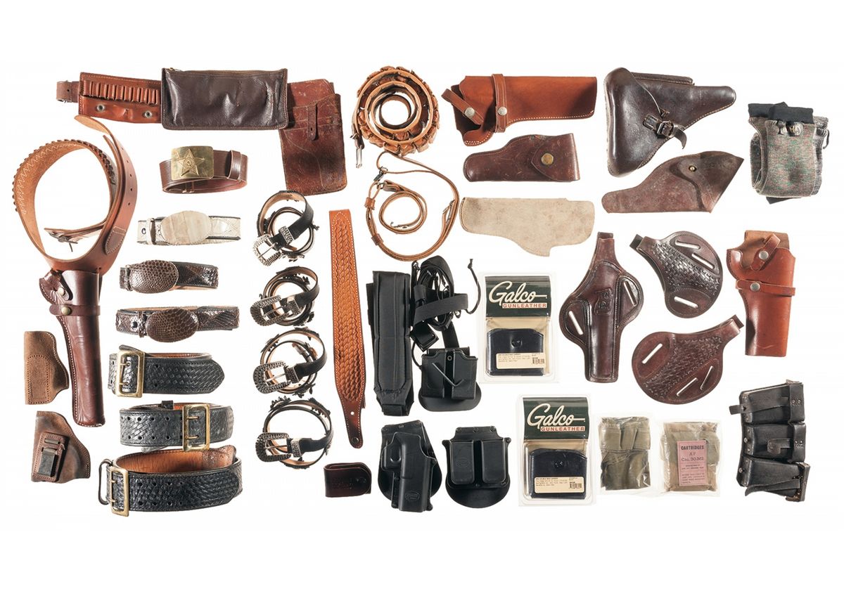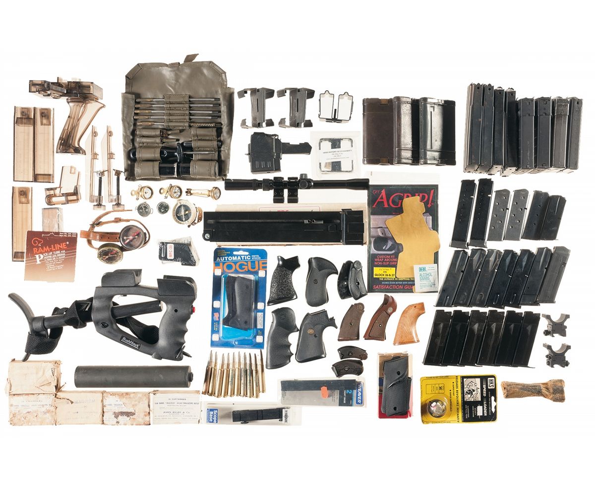 1 large dummy artillery shell, 1 Bush Hawk camera mount, 2 RDC magazine loaders, 1 M1 Carbine flash hider, 3 European military cleaning kit tins, 1 Tasco 3-7x20 scope with mounts, 1 military cleaning kit with storage pouch, 1 HKS Model 547 speedloader, 2 AR-15 magazine connectors, 3 unknown magazine connectors, 1 detachable SKS magazine, 1 set of heavy duty Barrett scope rings, 4 AR-15 magazines, Ram-Line magazine loading system, 8 military style compasses, 1 M-14/M1A magazine, 2 G3 magazines, 1 CZ527 scope base, 1 H&R topper scope base, 6 H&K P7M10 magazines, 1 Glock 40 S&W magazine, 10 unknown pistol magazines, 1 H&R gun lock, 2 1911 magazines, 1 fake suppressor, 3 sets of pistol night sights, 12 sets of various handgun grips, 6 boxes of .350 magnum ammunition, 12 unknown buttstocks, 5 plastic Winchester buttplates, 20 unknown plastic trigger guards, 2 cloth ammo bandoliers, 1 Fobus magazine carrier, 1 Fobus GL-3 holster, 2 leather gun belts with holsters, 1 Mitch Rosen magazine carrier, 10 leather holsters, 1 European military ammo pouch, 1 nylon web sling, 2 leather slings, 5 small Sack-Ups, 1 Russian belt, 1 shotshell belt, 1 Luger holster, 1 plastic 1911 dual magazine carrier, 2 Galco dual magazine carriers, 3 2 1/4 inch wide police style gun belts, 4 decorative belts, 1 white leather belt and 2 brown snakeskin belts. All counts are approximate.