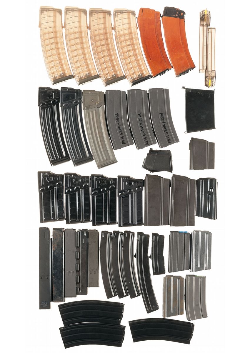 4 AR-15 6.8 SPC 25 round magazines, 1 M1A 5 round magazine, 3 M1A 10 round magazines, 4 MP5 LEO marked 30 round magazines, 1 MP5 30 round magazine, 1 Thompson stick magazine, 11 AR-15 30 round magazines, 8 Steyr AUG 42 round waffle magazines, 1 AK-47 5 round magazine, 2 AK-47 bakelite magazines, 4 Cobray MAC-9/11 stick magazines, 1 Sterling 34 round magazine, 1 shortened Sterling magazine, 11 PTR91 magazines, 2 Ruger 10/22 extended magazines, 1 Belgian Browning BAR .243/.308 magazine, 1 unknown magazine, 1 K98 trench magazine, 6 MP5 stick magazines, 5 HK93 magazines, 21 AR-15 20 round magazines, 2 AR-15 .450 Bushmaster magazines, 4 AR-15 9mm 25 round magazines, 2 AR-15 9mm 30 round magazines and 1 AR-15 9mm 40 round magazine.