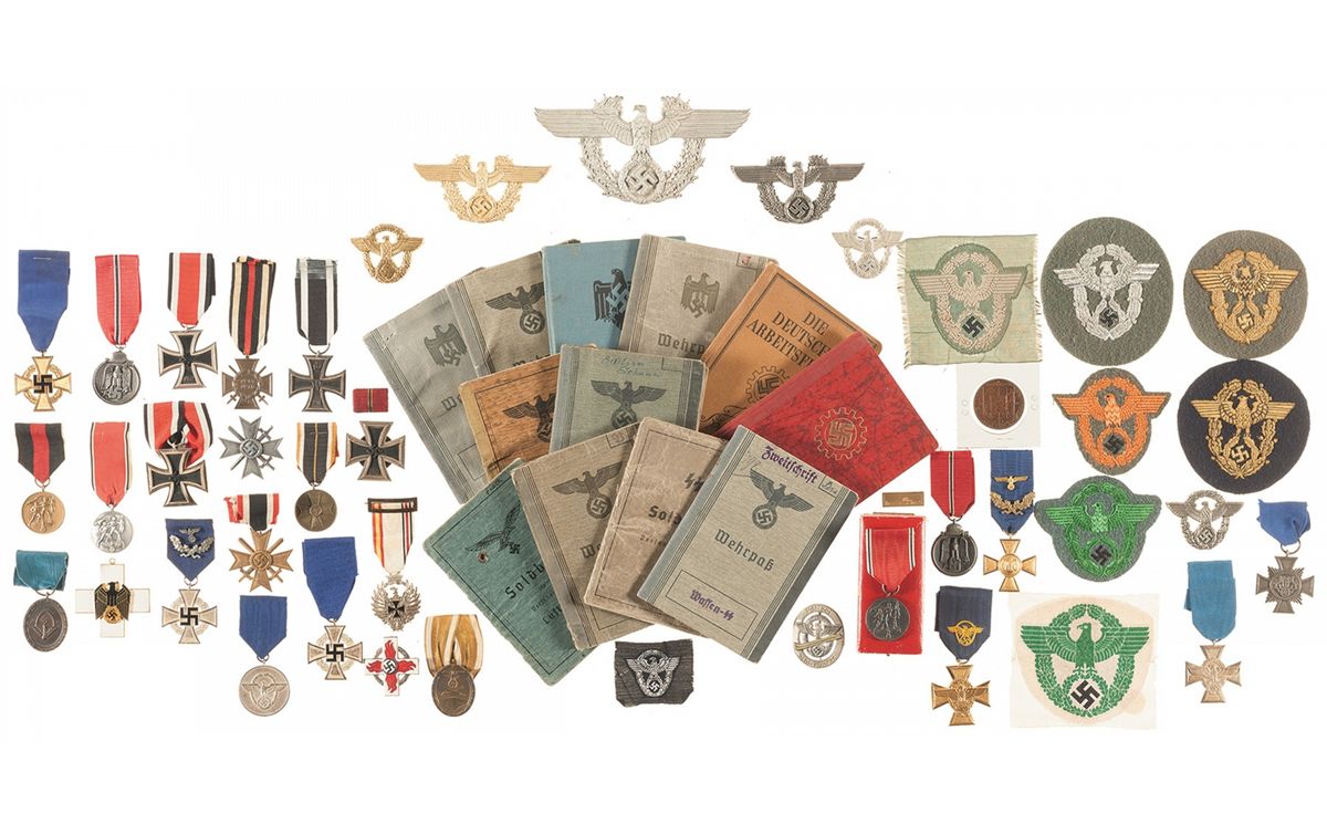 Grouping includes a number of Nazi Police patches and plaques, 25 Year Service Medal with 40 Year ribbon device, Austrian Anschluss medal with presentation box, WWI and WWII Iron Crosses, and an assortment of Soldbuch and Wehrpass documentation, including a pair made out to a SS-Rottenfuhrer of the Totenkopf Division. Items are very good overall.